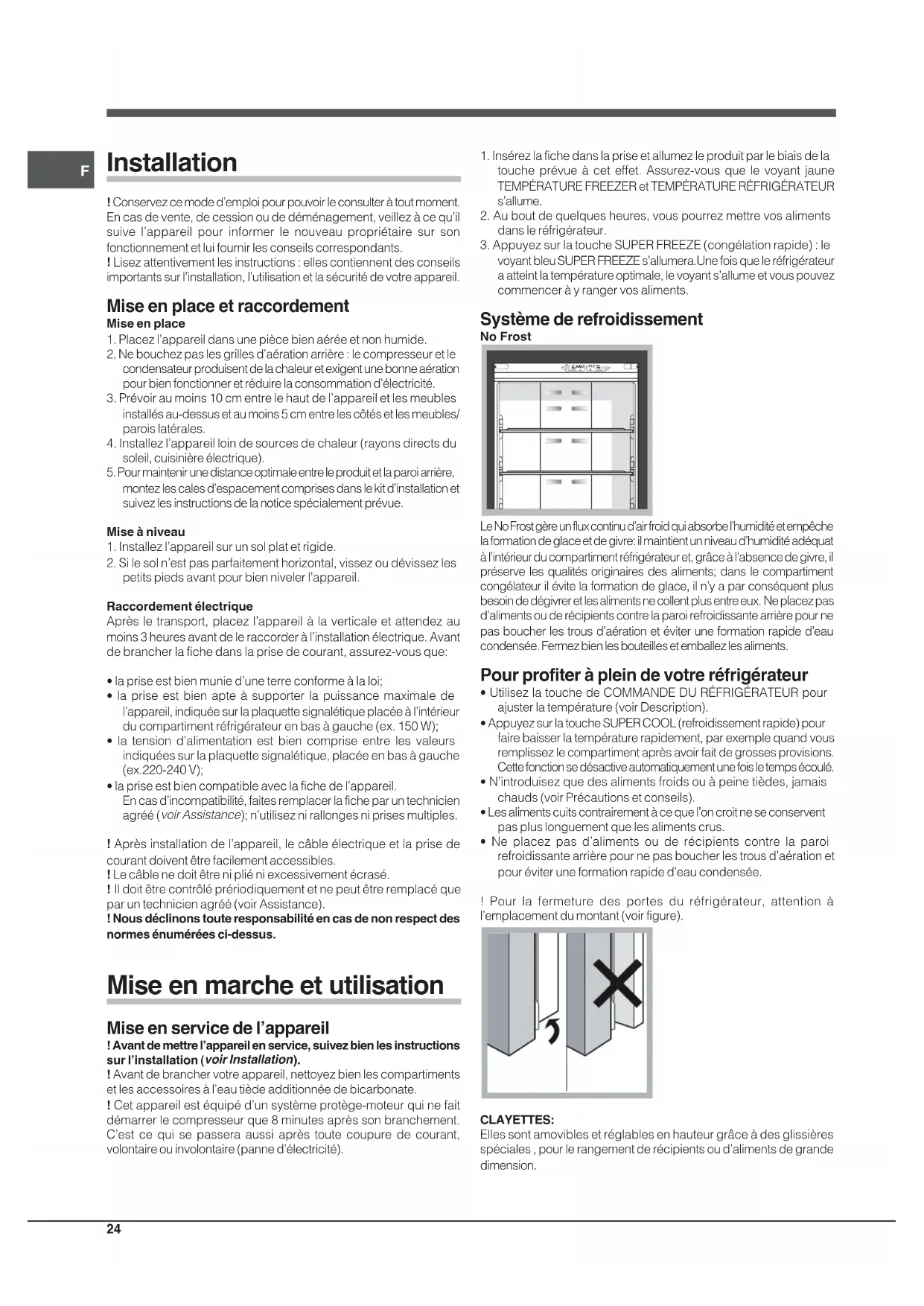 Lisez attentivement les instructions : elles contiennent des conseilsimportants sur l’installation, l’utilisation et la sécurité de votre appareil. Mise en place et raccordement Mise en place1. Placez l’appareil dans une pièce bien aérée et non humide.2. Ne bouchez pas les grilles d’aération arrière : le compresseur et lecondensateur produisent de la chaleur et exigent une bonne aérationpour bien fonctionner et réduire la consommation d’électricité.3. Prévoir au moins 10 cm entre le haut de l’appareil et les meublesinstallés au-dessus et au moins 5 cm entre les côtés et les meubles/parois latérales.4. Installez l’appareil loin de sources de chaleur (rayons directs dusoleil, cuisinière électrique).5. Pour maintenir une distance optimale entre le produit et la paroi arrière,montez les cales d’espacement comprises dans le kit d’installation etsuivez les instructions de la notice spécialement prévue.Mise à niveau1. Installez l’appareil sur un sol plat et rigide.2. Si le sol n’est pas parfaitement horizontal, vissez ou dévissez lespetits pieds avant pour bien niveler l’appareil.Raccordement électriqueAprès le transport, placez l’appareil à la verticale et attendez aumoins 3 heures avant de le raccorder à l’installation électrique. Avantde brancher la fiche dans la prise de courant, assurez-vous que:• la prise est bien munie d’une terre conforme à la loi;• la prise est bien apte à supporter la puissance maximale del’appareil, indiquée sur la plaquette signalétique placée à l’intérieurdu compartiment réfrigérateur en bas à gauche (ex. 150 W);• la tension d’alimentation est bien comprise entre les valeursindiquées sur la plaquette signalétique, placée en bas à gauche(ex.220-240 V);• la prise est bien compatible avec la fiche de l’appareil.En cas d’incompatibilité, faites remplacer la fiche par un technicienagréé ( voir Assistance ); n’utilisez ni rallonges ni prises multiples.! Après installation de l’appareil, le câble électrique et la prise decourant doivent être facilement accessibles.! Le câble ne doit être ni plié ni excessivement écrasé.! Il doit être contrôlé prériodiquement et ne peut être remplacé quepar un technicien agréé (voir Assistance).! Nous déclinons toute responsabilité en cas de non respect desnormes énumérées ci-dessus. Mise en marche et utilisation Mise en service de l’appareil ! Avant de mettre l’appareil en service, suivez bien les instructionssur l’installation ( voir Installation