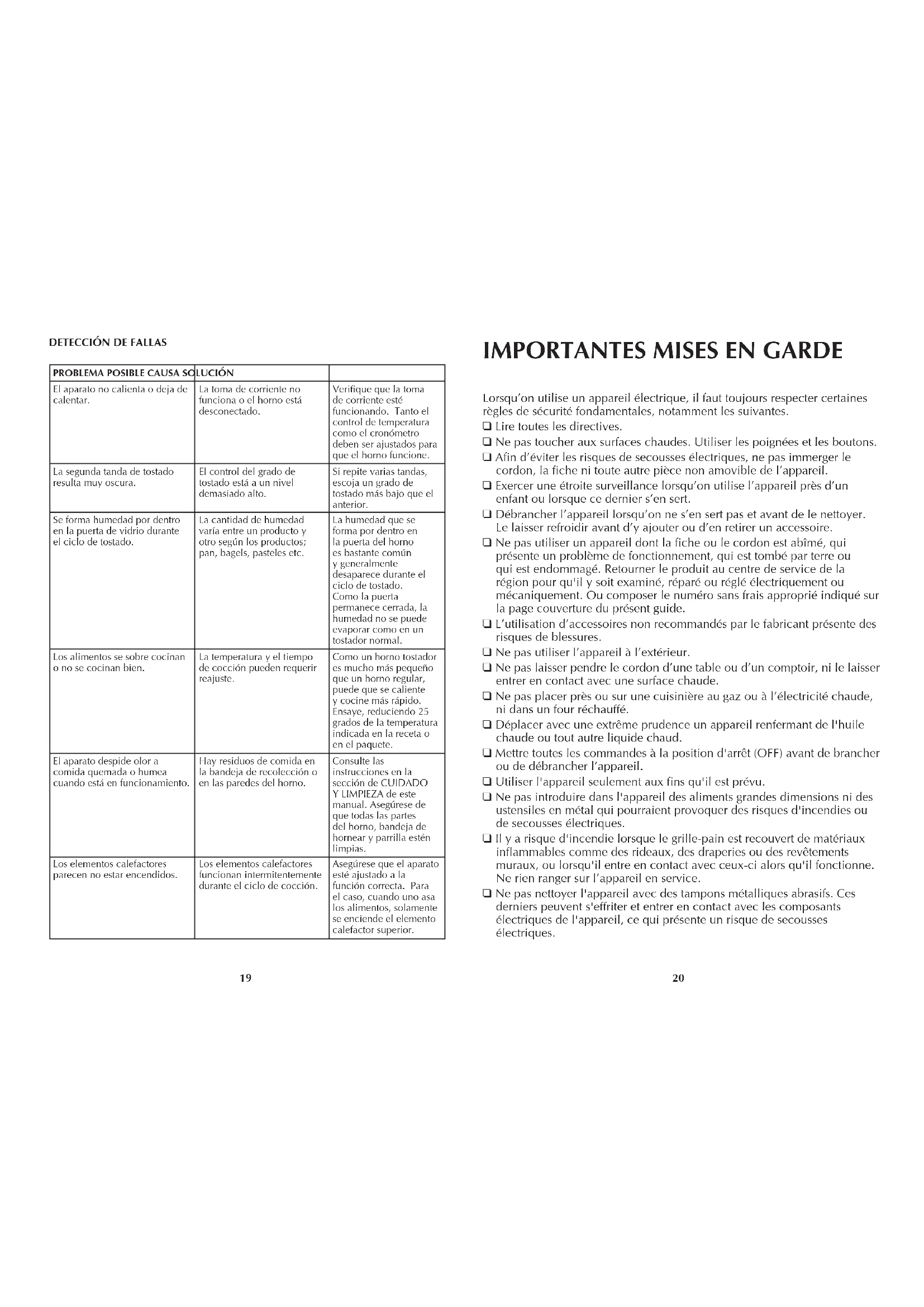Asegúrese de secar bien la bandeja antes de instalarla en el horno nuevamente. Superficies exteriores Importante: La superficie superior del horno se calienta; asegúrese de que el horno se haya enfriado bien antes de limpiarlo. Limpie la parte superior y demás superficies exteriores con un paño o con una esponja humedecida. Seque bien con un paño suave o con papel de toalla. Recipientes de cocinar Este aparato le permite utilizar recipientes de metal, de vidrio resistente al calor o de cerámica sin tapas de vidrio. Siga las indicaciones del fabricante. Asegúrese de que haya un espacio mínimo de 2,54 cm (1”) entre el borde superior del recipiente y los elementos calefactores. ELorsqu’on utilise un appareil électrique, il faut toujours respecter certaines règles de sécurité fondamentales, notamment les suivantes. ❑ Lire toutes les directives. ❑ Ne pas toucher aux surfaces chaudes. Utiliser les poignées et les boutons. ❑ Afin d’éviter les risques de secousses électriques, ne pas immerger le cordon, la fiche ni toute autre pièce non amovible de l’appareil. ❑ Exercer une étroite surveillance lorsqu’on utilise l’appareil près d’un enfant ou lorsque ce dernier s’en sert. ❑ Débrancher l’appareil lorsqu’on ne s’en sert pas et avant de le nettoyer. Le laisser refroidir avant d’y ajouter ou d’en retirer un accessoire. ❑ Ne pas utiliser un appareil dont la fiche ou le cordon est abîmé, qui présente un problème de fonctionnement, qui est tombé par terre ou qui est endommagé. Retourner le produit au centre de service de la région pour qu'il y soit examiné, réparé ou réglé électriquement ou mécaniquement. Ou composer le numéro sans frais approprié indiqué sur la page couverture du présent guide. ❑ L’utilisation d’accessoires non recommandés par le fabricant présente des risques de blessures. ❑ Ne pas utiliser l’appareil à l’extérieur. ❑ Ne pas laisser pendre le cordon d’une table ou d’un comptoir, ni le laisser entrer en contact avec une surface chaude. ❑ Ne pas placer près ou sur une cuisinière au gaz ou à l’électricité chaude, ni dans un four réchauffé. ❑ Déplacer avec une extrême prudence un appareil renfermant de l'huile chaude ou tout autre liquide chaud. ❑ Mettre toutes les commandes à la position d'arrêt (OFF) avant de brancher ou de débrancher l’appareil. ❑ Utiliser l'appareil seulement aux fins qu'il est prévu. ❑ Ne pas introduire dans l'appareil des aliments grandes dimensions ni des ustensiles en métal qui pourraient provoquer des risques d'incendies ou de secousses électriques. ❑ Il y a risque d'incendie lorsque le grille-pain est recouvert de matériaux inflammables comme des rideaux, des draperies ou des revêtements muraux, ou lorsqu'il entre en contact avec ceux-ci alors qu'il fonctionne. Ne rien ranger sur l’appareil en service. ❑ Ne pas nettoyer l'appareil avec des tampons métalliques abrasifs. Ces derniers peuvent s'effriter et entrer en contact avec les composants électriques de l'appareil, ce qui présente un risque de secousses électriques.