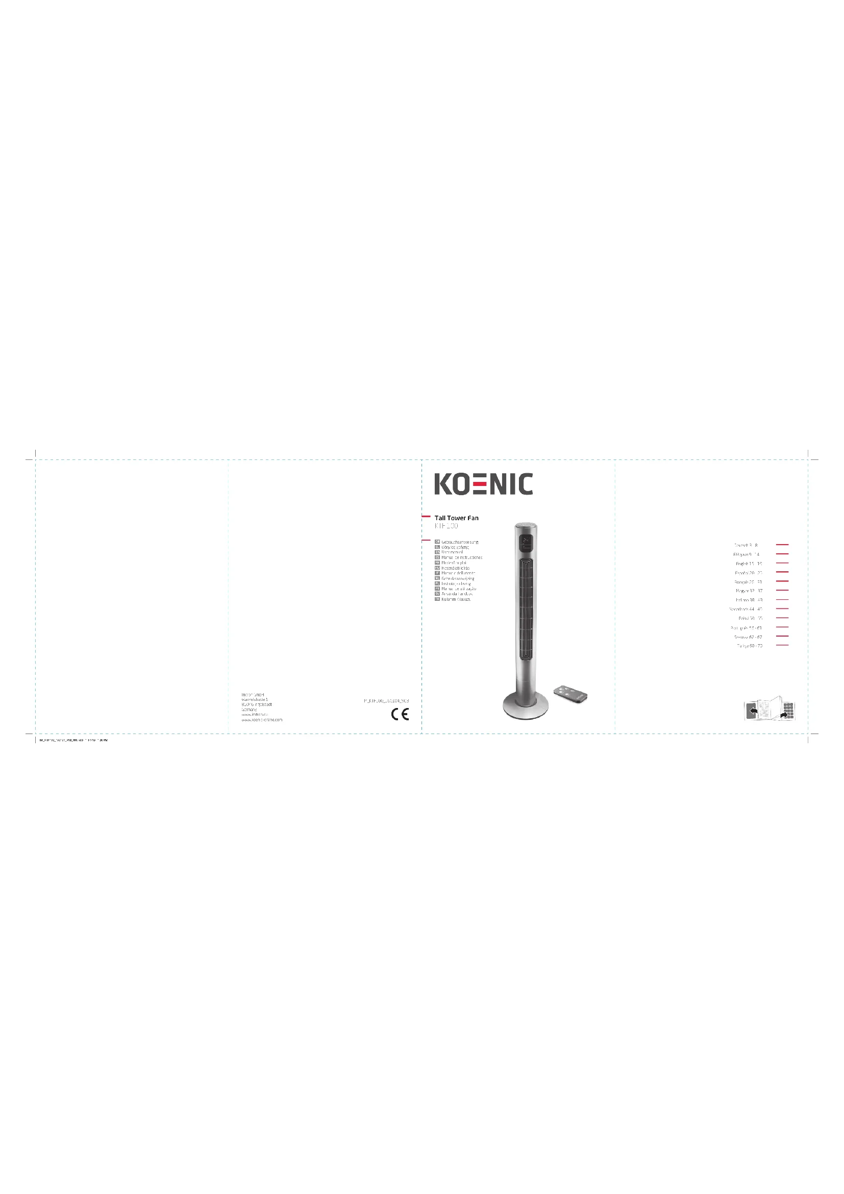 Rangement pour la télécommande (non illustré) Félicitations! Merci d’avoir acheté un produit KOENIC. Veuillez lire soigneusement ce manuel et le conserver pour une consultation future. Utilisation recommandee Le produit n’est conçu que pour faire circuler l’air dans une pièce. N’utilisez l’appareil qu’en respectant ces consignes. Toute autre utilisation peut endommager le produit ou causer des blessures. Imtron GmbH n’assume aucune responsabilité quant à des dommages au produit, à des dommages matériels ou à des blessures corporelles dus à une négligence ou un usage inapproprié du produit, ou à un usage du produit non indiqué par le fabricant. Déballage et vérification du produit Avant de l’utiliser pour la premiere fois Retirez soigneusement le produit et les accessoires de leur emballage d’origine. Il est conseillé de conserver l’emballage d’origine pour le rangement. Si vous souhaitez disposer de l’emballage d’origine, veuillez respecter les recommandations légales en vigueur. Si vous avez des questions concernant le rebut approprié, contactez le service de déchetterie local. Vérifiez que le contenu est complet et qu’il n’est pas endommagé. Si le contenu livré est incomplet ou endommagé, contactez immédiatement votre revendeur. Après avoir déballé, veuillez consulter la section Nettoyage et entretien. Ne pas éliminer cet appareil dans les déchets ménagers municipaux non triés. Les retourner au point de collecte désigné pour le recyclage des WEEE. Se conduire ainsi aidera à préserver les ressources et à protéger l’environnement. Contacter votre revendeur ou les autorités locales pour de plus amples informations. Jetez les piles en respectant l’environnement. Ne jetez pas les piles dans les ordures ménagères. Rapportezles dans un centre de collecte local ou contactez le revendeur où vous avez acheté ce produit. IM_KTF100_160104_V03_HR.indb 29 4/1/16 1:31 PM30 Français