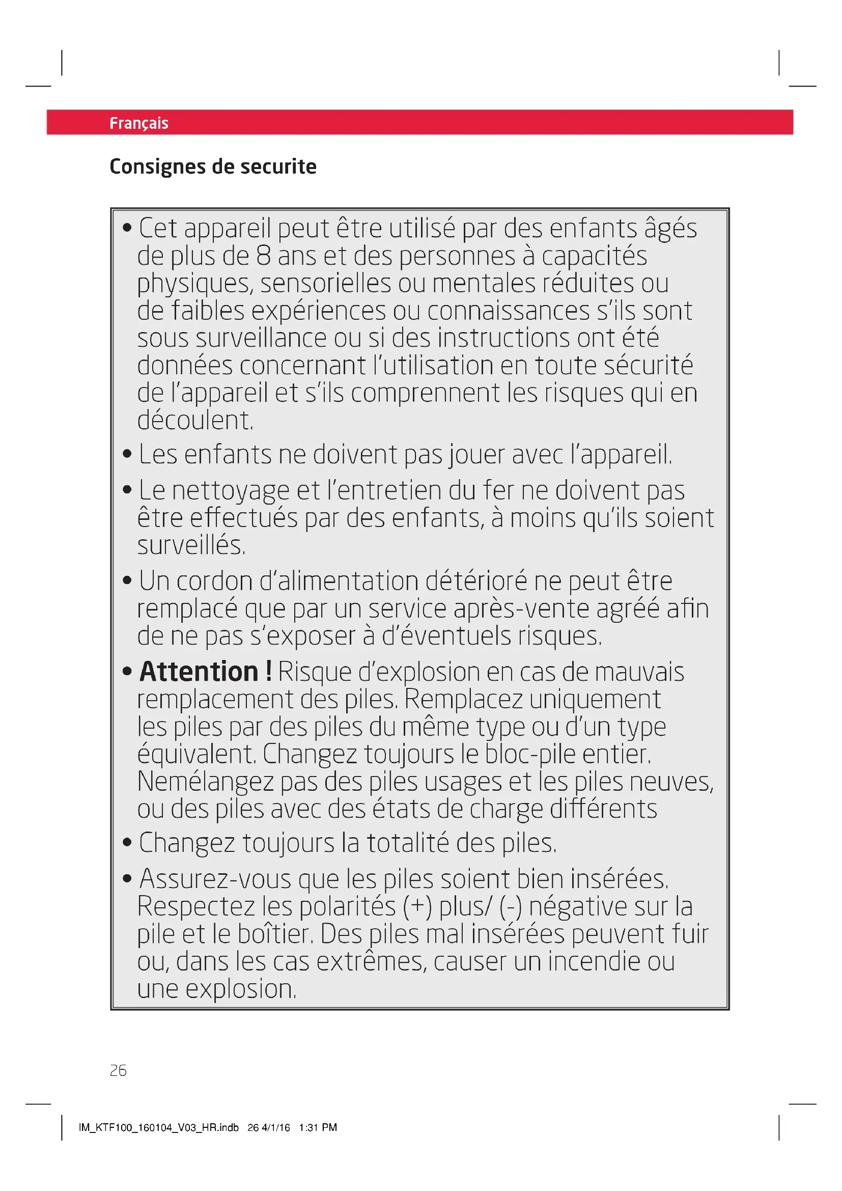 - Assurez-vous que les piles soient bien insérées. Respectez les polarités (+) plus/ (-) négative sur la pile et le boîtier. Des piles mal insérées peuvent fuir ou, dans les cas extrêmes, causer un incendie ou une explosion. IM_KTF100_160104_V03_HR.indb 26 4/1/16 1:31 PMFrançais