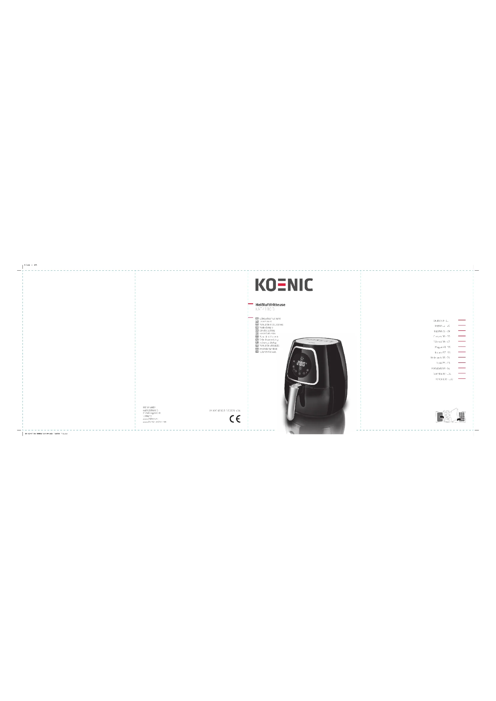 - L’huile et la graisse s’enflamment facilement. L’huile et la graisse ne doivent pas goutter sur les éléments chauants. IM_KAF4110B_180803_V04_HR.indb 33 3/8/18 11:06 am34 Français Size - A5 Félicitations!! Merci d’avoir acheté un produit KOENIC. Veuillez lire soigneusement ce manuel et le conserver pour une consultation future. Usage prévu Ce produit convient uniquement à la préparation des aliments. Toute autre utilisation peut provoquer l’endommagement de l’appareil ou des blessures. Imtron GmbH n’assume aucune responsabilité quant à des dommages au produit, à des dommages matériels ou à des blessures corporelles dus à une négligence ou un usage inapproprié du produit, ou à un usage du produit non indiqué par le fabricant. Avant de l’utiliser pour la Premiere fois Retirez soigneusement le produit et les accessoires de leur emballage d’origine. Il est conseillé de conserver l’emballage d’origine pour le rangement. Si vous souhaitez disposer de l’emballage d’origine, veuillez respecter les recommandations légales en vigueur. Si vous avez des questions concernant le rebut approprié, contactez le service de déchetterie local. Vérifiez que le contenu est complet et qu’il n’est pas endommagé. Si le contenu livré est incomplet ou endommagé, contactez immédiatement votre revendeur. Après avoir déballé, veuillez consulter la section Nettoyage et entretien. Pour éliminer les résidus de fabrication, faites fonctionner le produit pendant environ 10 minutes sans aucun aliment. Veuillez consulter la section Utilisation. Assurez-vous qu’il y a une ventilation susante dans la mesure où le produit peut émettre une légère odeur ainsi que de la fumée. Cela est sans danger et disparaîtra rapidement. Mise au rebut Ne pas éliminer cet appareil dans les déchets ménagers municipaux non triés. Les retourner au point de collecte désigné pour le recyclage des WEEE. Se conduire ainsi aidera à préserver les ressources et à protéger l’environnement. Contacter votre revendeur ou les autorités locales pour de plus amples informations. Contenu du produit 1 x Friteuse à air chaud 1 x Cuve à friture avec grille 1 x Mode d’emploi Données techniques Tension nominale : 220 - 240 V~ Puissance nominale : 1300 W Fréquence nominale : 50/60 Hz Contrôle et composants