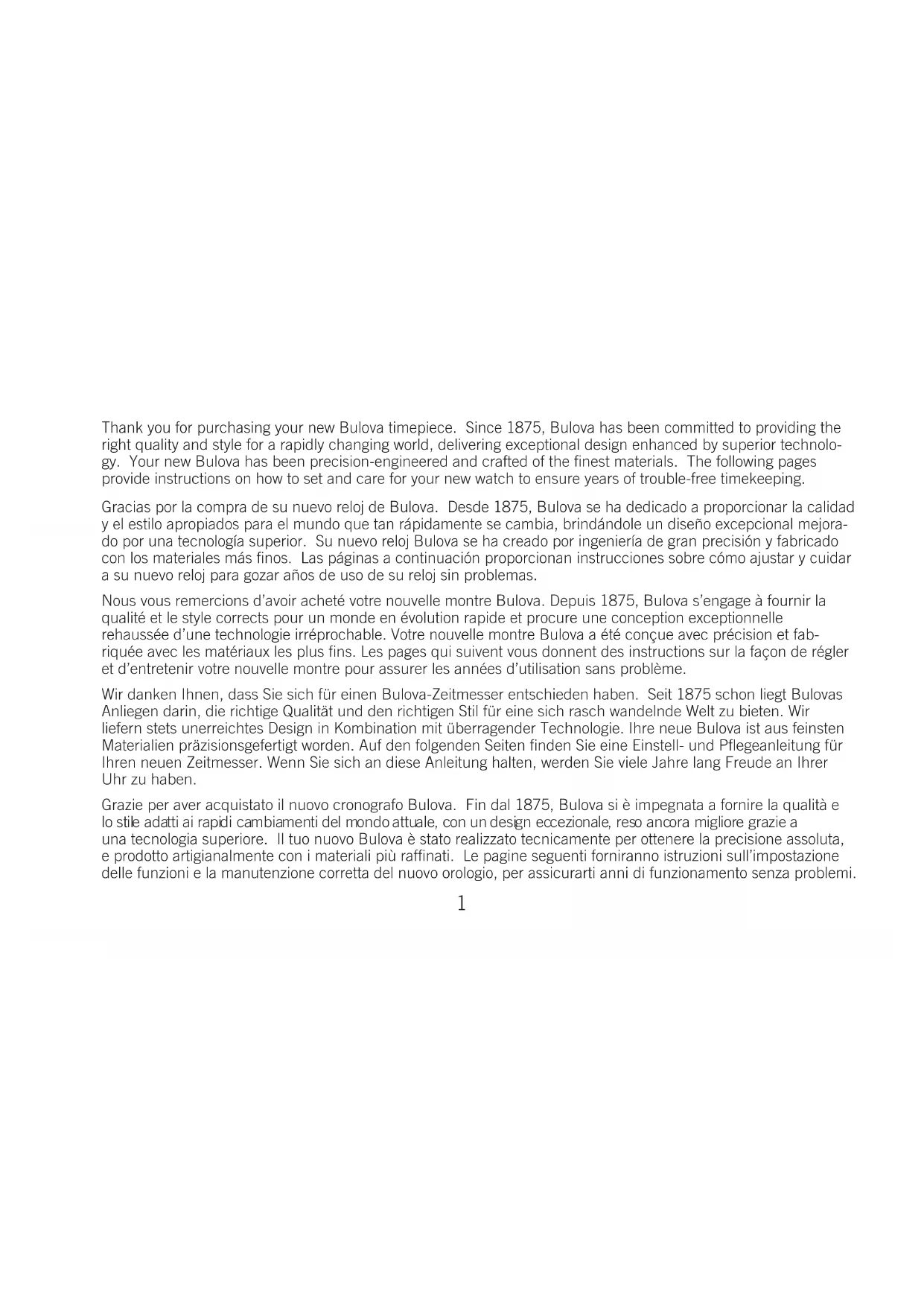 Votre nouvelle montre à quartz est équipée d'une pile neuve conçue pour vous offrir une fiabilité maximale pendant environ un an d'utilisation normale. Si la pile n'est pas remplacée avant qu'elle ne soit épuisée, la montre tout simplement s'arrêtera. Le mécanisme ne devra pas être modifié ou détruit de n'importe quelle manière. Cependant, lorsque la pile est épuisée, elle devra être retirée dès que cela est possible afin de minimiser tout risque de fuite. Ne rangez jamais votre montre contenant une pile usagée. La montre devrait être apportée à un concessionnaire Bulova agréé pour le remplacement de la pile. Afin de garantir la meilleure performance possible, une nouvelle pile appropriée devrait être utilisée. Remarque : lorsque la couronne est dans la position « SORTIE », le moteur et les aiguilles s'arrêtent. Seul le cristal à quartz continue à vibrer, n'utilisant que très peu de puissance. Si la montre doit être rangée pendant une longue période, il est recommandé de laisser la couronne dans la position «SORTIE » afin de prolonger la durée de vie de la pile. Cette précaution ne s'applique pas aux modèles avec uniquement deux aiguilles. GARANTIE LIMITÉE CONCERNANT L’UTILISATION EN EAU PROFONDE En complément et sous réserve de toutes les dispositions et de la durée de la garantie de base limitée de la montre Bulova, les montres pour eau profonde sont garanties étanches lorsque submergées à la profondeur indiquée sur le cadran, pourvu que le quartz et la couronne demeurent intacts et que le boîtier n’ait pas été ouvert. Pour préserver l’imperméabilité à l’eau de votre montre, en particulier si un facteur de sécurité est en cause, faites-la vérifier, nettoyer ou 30réparer de temps à autre au besoin par un horloger compétent. De plus, le porteur devrait éviter de manipuler la couronne de remontoir sous l’eau. ÉTANCHÉITÉ Les modèles de montre marqués uniquement « Étanche » sur le fond du boîtier, sans précision de profondeurs ne doivent pas être utilisés pour la natation. Pour nager nous vous conseillons les modèles portant les mentions supplémentaires “50m,” “100m”ou “200m”. ÉTANCHE JUSQU’À 300 M (300m MARQUÉE) Il est recommandé d’utiliser ce produit à des fins récréatives seulement. La profondeur en mètres montrée sur la montre n’indique pas la profondeur de la plongée de la montre, mais plutôt la pression d’air utilisée lors du test d’étanchéité du produit conformément aux normes de l’industrie. BULOVA GARANTIE LIMITÉE DE 3 ANS : Votre nouvelle montre Bulova est garantie uniquement au propriétaire initial, par Bulova, pour 3 ans à compter de la date d’achat. La garantie n’entre en vigueur que si la carte de garantie est entièrement et correctement complétée par un revendeur agréé Bulova au moment de l’achat et/ou vous fournissez une preuve d’achat originale. Couverture : La garantie couvre les pièces de la montre qui ont échoué à cause de vice de matériaux ou de fabrication dans des conditions normales d’utilisation, ou, Bulova à sa discrétion, remplacera la montre par une montre comparable. Cette garantie ne couvre pas :