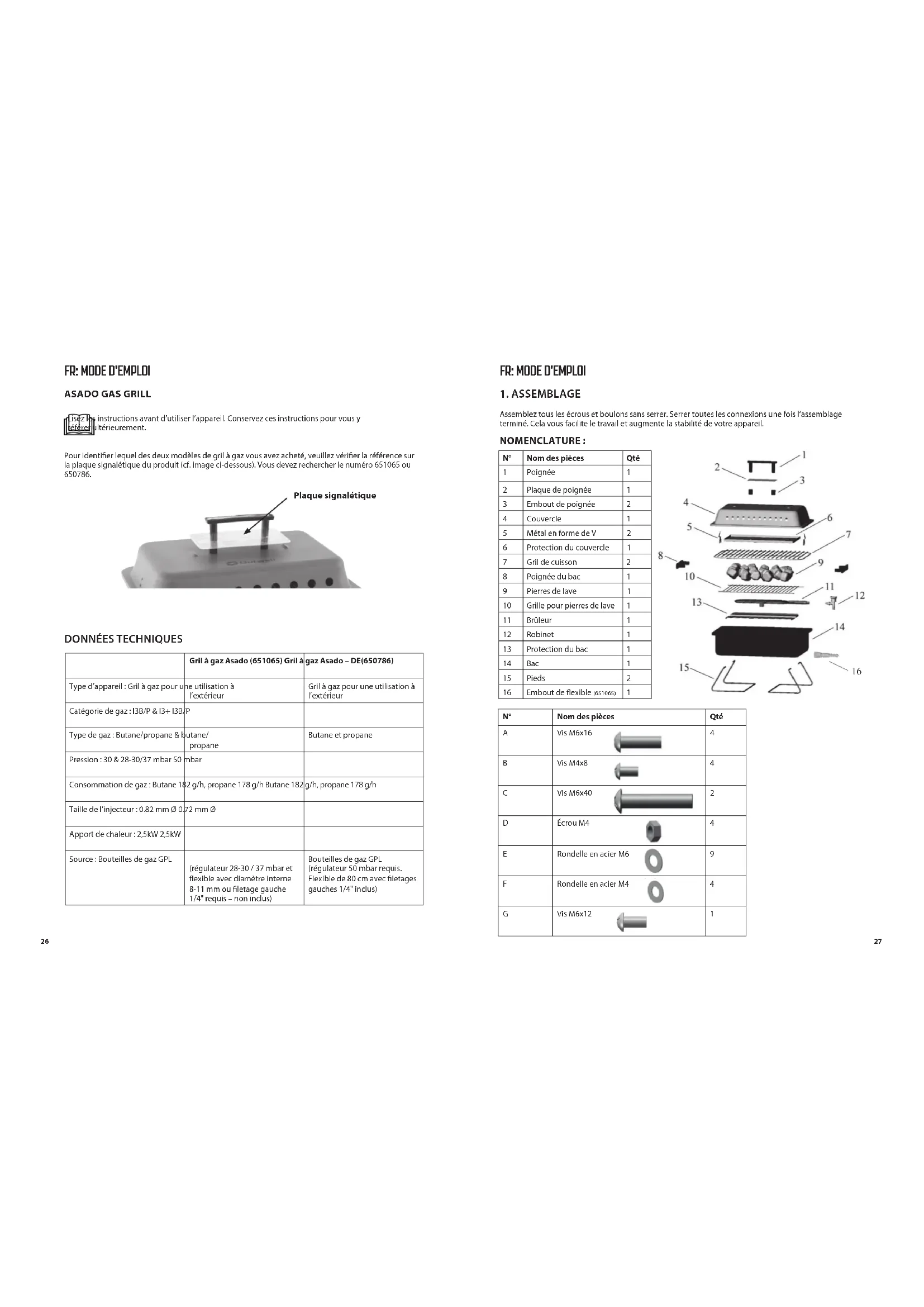 Steel washer crew N° Nom des pièces Qté1 Poignée 12 Plaque de poignée 13 Embout de poignée 24 Couvercle 15 Métal en forme de V 26 Protection du couvercle 17 Gril de cuisson 28 Poignée du bac 19 Pierres de lave 110 Grille pour pierres de lave 111 Brûleur 112 Robinet 113 Protection du bac 114 Bac 115 Pieds 216 Embout de exible (651065) 1