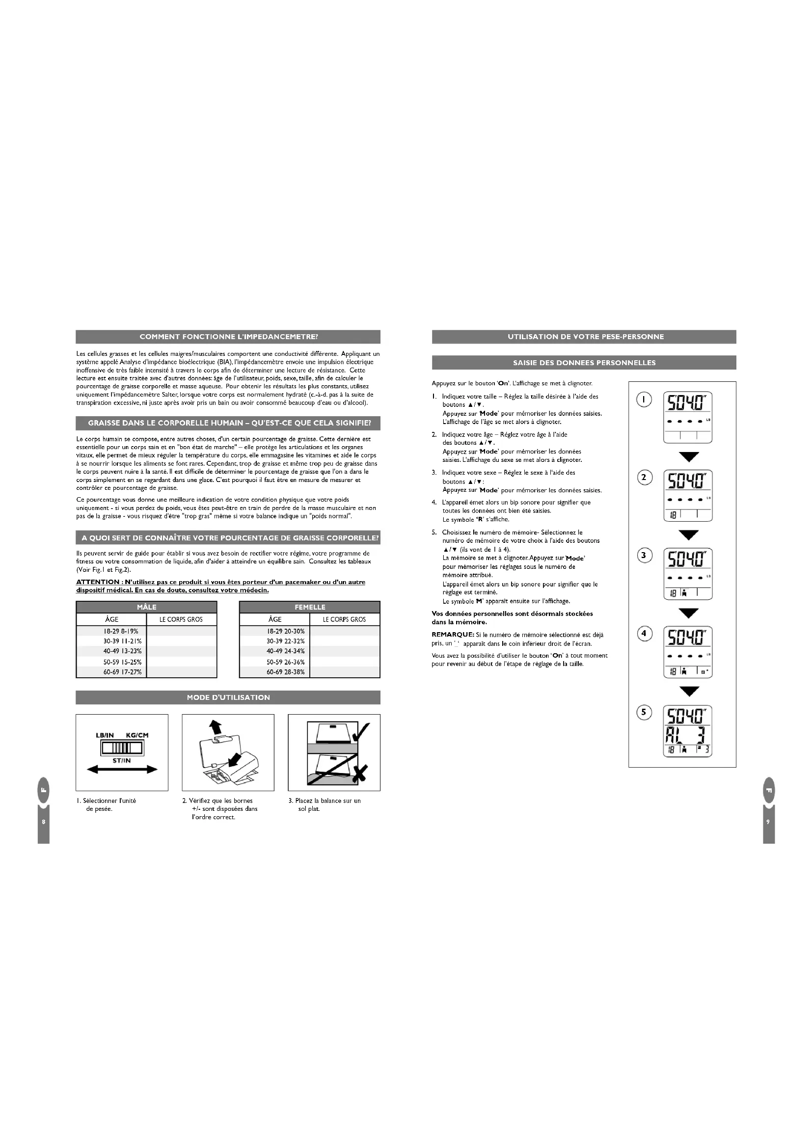 Le corps humain se compose, entre autres choses, d'un certain pourcentage de graisse. Cette dernière est essentielle pour un corps sain et en "bon état de marche" – elle protège les articulations et les organes vitaux, elle permet de mieux réguler la température du corps, elle emmagasine les vitamines et aide le corps à se nourrir lorsque les aliments se font rares. Cependant, trop de graisse et même trop peu de graisse dans le corps peuvent nuire à la santé. Il est difficile de déterminer le pourcentage de graisse que l'on a dans le corps simplement en se regardant dans une glace. C'est pourquoi il faut être en mesure de mesurer et contrôler ce pourcentage de graisse.Ce pourcentage vous donne une meilleure indication de votre condition physique que votre poids uniquement - si vous perdez du poids, vous êtes peut-être en train de perdre de la masse musculaire et non pas de la graisse - vous risquez d'être "trop gras" même si votre balance indique un "poids normal". GRAISSE DANS LE CORPORELLE HUMAIN – QU'EST-CE QUE CELA SIGNIFIE? Ils peuvent servir de guide pour établir si vous avez besoin de rectifier votre régime, votre programme de fitness ou votre consommation de liquide, afin d’aider à atteindre un équilibre sain. Consultez les tableaux (Voir Fig.1 et Fig.2). ATTENTION : N’utilisez pas ce produit si vous êtes porteur d’un pacemaker ou d’un autre dispositif médical. En cas de doute, consultez votre médecin. A QUOI SERT DE CONNAÎTRE VOTRE POURCENTAGE DE GRAISSE CORPORELLE? 1. Sélectionner l'unité de pesée.2. Vérifiez que les bornes +/- sont disposées dans l’ordre correct.3. Placez la balance sur un sol plat. MODE D'UTILISATION MÂLEÂGELE CORPS GROS18-29 8-19%30-39 11-21%40-49 13-23%50-59 15-25%60-69 17-27%FEMELLEÂGELE CORPS GROS18-29 20-30%30-39 22-32%40-49 24-34%50-59 26-36%60-69 28-38% Les cellules grasses et les cellules maigres/musculaires comportent une conductivité différente. Appliquant un système appelé Analyse d'impédance bioélectrique (BIA), l’impédancemètre envoie une impulsion électrique inoffensive de très faible intensité à travers le corps afin de déterminer une lecture de résistance. Cette lecture est ensuite traitée avec d’autres données: âge de l’utilisateur, poids, sexe, taille, afin de calculer le pourcentage de graisse corporelle et masse aqueuse. Pour obtenir les résultats les plus constants, utilisez uniquement l’impédancemètre Salter, lorsque votre corps est normalement hydraté (c.-à-d. pas à la suite de transpiration excessive, ni juste après avoir pris un bain ou avoir consommé beaucoup d’eau ou d’alcool). COMMENT FONCTIONNE L’IMPEDANCEMETRE? Appuyez sur le bouton ‘On’.L’affichage se met à clignoter.