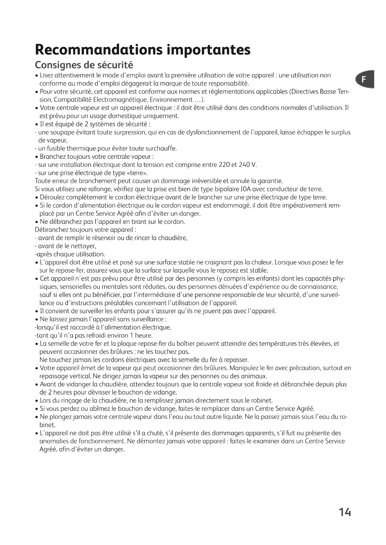 - Votre centrale vapeur est un appareil électrique : il doit être utilisé dans des conditions normales d’utilisation. Il est prévu pour un usage domestique uniquement.