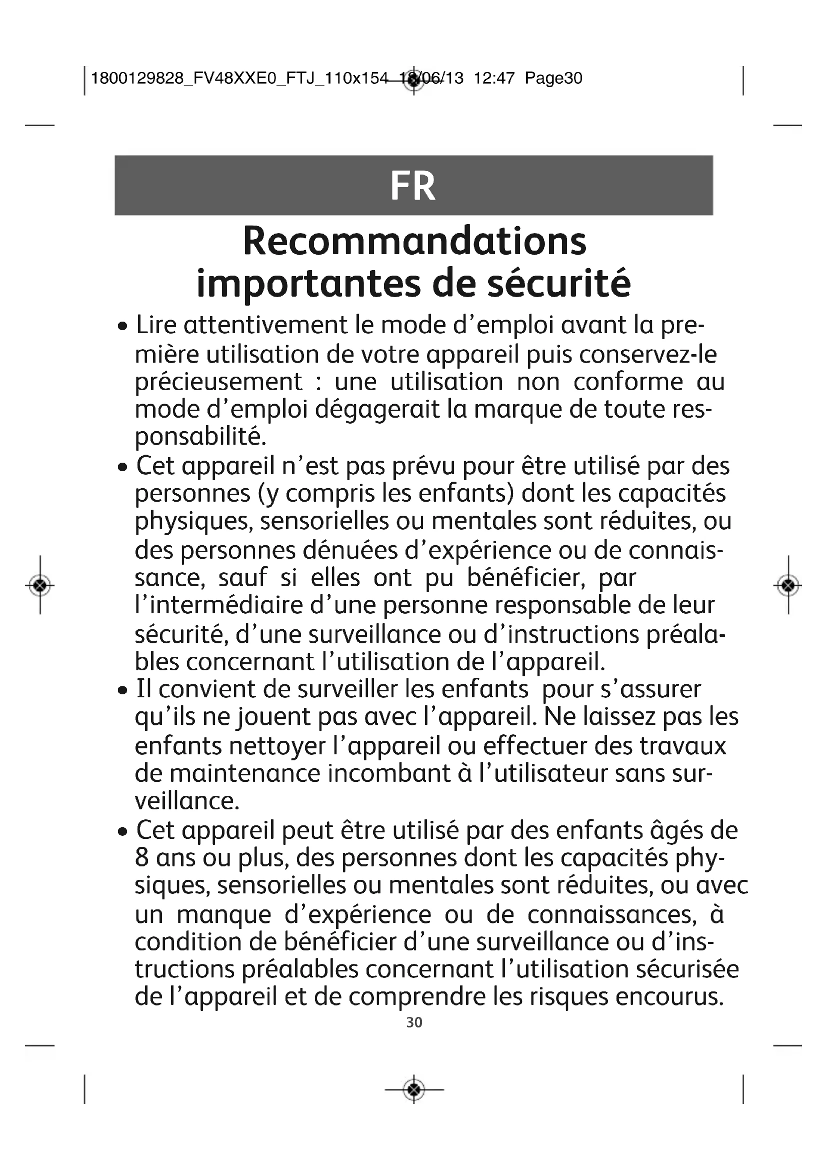 - Cet appareil peut être utilisé par des enfants âgés de 8 ans ou plus, des personnes dont les capacités phy- siques, sensorielles ou mentales sont réduites, ou avec un manque d’expérience ou de connaissances, à condition de bénéficier d’une surveillance ou d’ins- tructions préalables concernant l’utilisation sécurisée de l’appareil et de comprendre les risques encourus. 1800129828_FV48XXE0_FTJ_110x154 18/06/13 12:47 Page3031