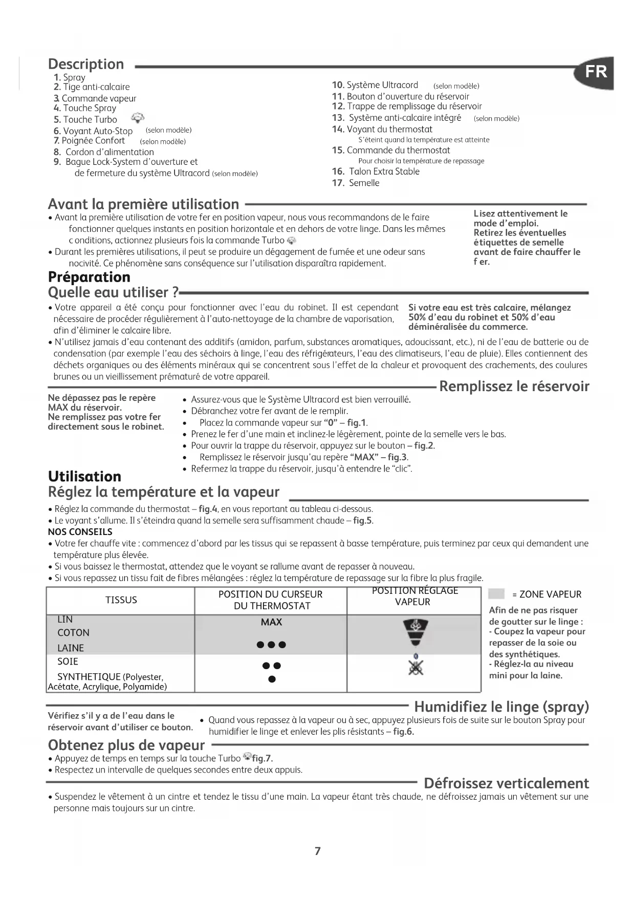 . Commande vapeur4. Touche Spray5. Touche Turbo 6. Voyant Auto-Stop (selon modèle) . Poignée Confort (selon modèle)8. Cordon d’alimentation9. Bague Lock-System d’ouverture etde fermeture du système Ultracord (selon modèle)10. Système Ultracord (selon modèle)11. Bouton d’ouverture du réservoir 2. Trappe de remplissage du réservoir13. Système anti-calcaire intégré (selon modèle)14. Voyant du thermostatS’éteint quand la température est atteinte15. Commande du thermostatPour choisir la température de repassage16. Talon Extra Stable17. Semelle Avant la première utilisation