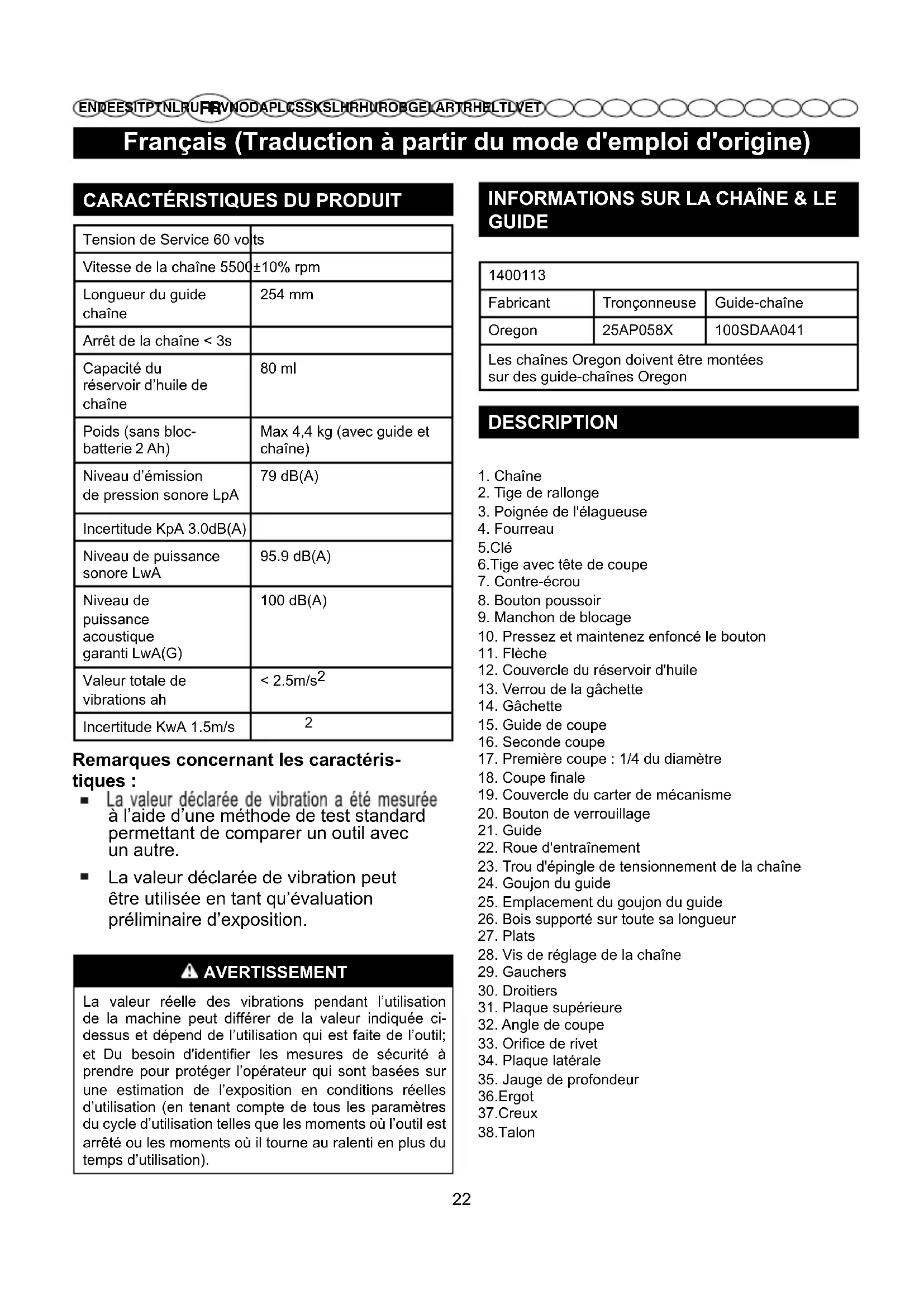 GUIDE 1400113Fabricant Tronçonneuse Guide-chaîneOregon 25AP058X 100SDAA041Les chaînes Oregon doivent être montéessur des guide-chaînes Oregon DESCRIPTION 1. Chaîne2. Tige de rallonge3. Poignée de l'élagueuse4. Fourreau5.Clé6.Tige avec tête de coupe7. Contre-écrou8. Bouton poussoir9. Manchon de blocage10. Pressez et maintenez enfoncé le bouton11. Flèche12. Couvercle du réservoir d'huile13. Verrou de la gâchette14. Gâchette15. Guide de coupe16. Seconde coupe17. Première coupe : 1/4 du diamètre18. Coupe nale19. Couvercle du carter de mécanisme20. Bouton de verrouillage21. Guide22. Roue d'entraînement23. Trou d'épingle de tensionnement de la chaîne24. Goujon du guide25. Emplacement du goujon du guide26. Bois supporté sur toute sa longueur27. Plats28. Vis de réglage de la chaîne29. Gauchers30. Droitiers31. Plaque supérieure32. Angle de coupe33. Orice de rivet34. Plaque latérale35. Jauge de profondeur36.Ergot37.Creux38.Talon Remarques concernant les caractéris- tiques : à l’aide d’une méthode de test standard permettant de comparer un outil avec un autre. La valeur déclarée de vibration peut être utilisée en tant qu’évaluation préliminaire d’exposition.