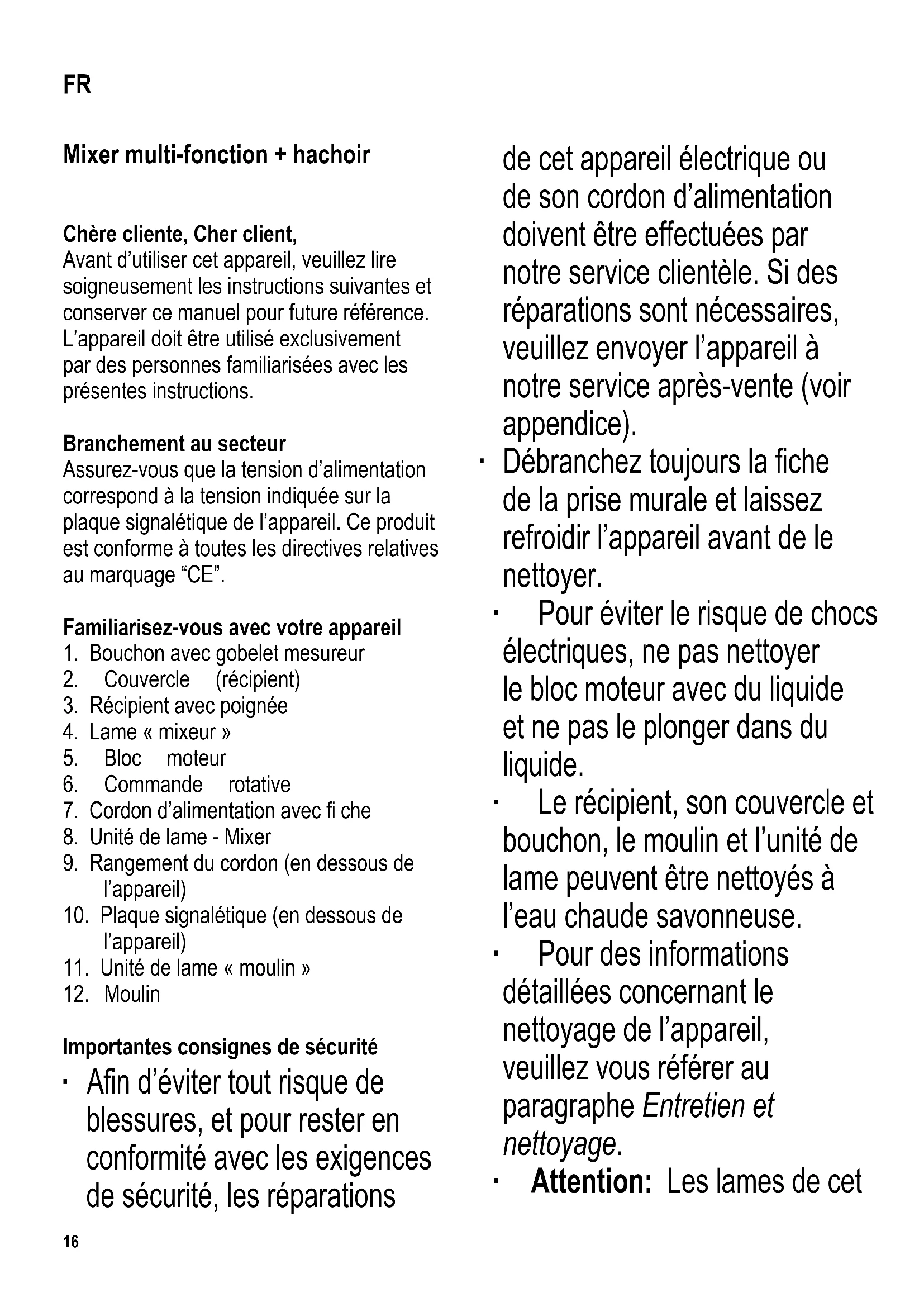 Importantes consignes de sécurité ∙ A fi n d’éviter tout risque de blessures, et pour rester en conformité avec les exigences de sécurité, les réparations de cet appareil électrique ou de son cordon d’alimentation doivent être effectuées par notre service clientèle. Si des réparations sont nécessaires, veuillez envoyer l’appareil à notre service après-vente (voir appendice). ∙ Débranchez toujours la fi che de la prise murale et laissez refroidir l’appareil avant de le nettoyer. ∙ Pour éviter le risque de chocs électriques, ne pas nettoyer le bloc moteur avec du liquide et ne pas le plonger dans du liquide. ∙ Le récipient, son couvercle et bouchon, le moulin et l’unité de lame peuvent être nettoyés à l’eau chaude savonneuse. ∙ Pour des informations détaillées concernant le nettoyage de l’appareil, veuillez vous référer au paragraphe Entretien et nettoyage. ∙ Attention : Les lames de cet FR17 appareil sont extrêmement acérées. Pour éviter de vous blesser, prenez toutes les précautions lorsque vous nettoyez l’appareil et lorsque vous videz le récipient. ∙ Attention : Ne pas verser de liquides chauds dans le récipient. ∙ Versez avec précaution les liquides chauds dans le récipient car des jets de vapeur peuvent s’échapper de l’appareil. ∙ Versez uniquement des petites quantités de liquides (par ex. huile pour pistou) dans le moulin. ∙ Attention : Une mauvaise utilisation peut provoquer des blessures corporelles graves. ∙ Eteignez toujours l’appareil et débranchez la fi che de la prise murale - lorsque l’appareil fonctionne sans surveillance, - avant d’ouvrir le couvercle, - avant de retirer ou d’installer le récipient ou le moulin, - en cas de fonctionnement défectueux durant l’emploi, - avant tout nettoyage, - après l’emploi. ∙ Ne tirez jamais le cordon quand vous enlevez la fi che de la prise murale, prenez la fi che en main. ∙ Cet appareil est destiné à être utilisé dans des applications domestiques et analogues telles que : - des coins cuisines réservés au personnel dans des magasins, bureaux et autres environnements professionnels ; - des fermes ; - l’utilisation par les clients des hôtels, motels et autres environnements à caractère résidentiel ; - des environnements de type chambres d’hôtes. ∙ Cet appareil peut être utilisé par des enfants âgés d’au moins 8ans, à condition qu’ils18 bénéfi cient d’une surveillance ou qu’ils aient reçu des instructions quant à l’utilisation de l’appareil en toute sécurité et qu’ils comprennent bien les dangers encourus. ∙ Le nettoyage et l’entretien par l’utilisateur ne doivent pas être effectués par des enfants, à moins qu’ils ne soient âgés de plus de 8 ans et qu’ils soient sous la surveillance d’un adulte. ∙ Conserver l’appareil et son câble hors de portée des enfants âgés de moins de 8ans. ∙ Cet appareil peut être utilisé par des personnes dont les capacités physiques, sensorielles ou mentale sont réduites ou dont l’expérience ou les connaissances ne sont pas suffi santes, à condition qu’ils bénéfi cient d’une surveillance ou qu’ils aient reçu des instructions quant à l’utilisation de l’appareil en toute sécurité et en comprennent bien les dangers potentiels. ∙ Les enfants ne doivent pas utiliser l’appareil comme un jouet. ∙ Attention : Tenez les enfants à l’écart des emballages, qui représentent un risque potentiel, par exemple, de suffocation. ∙ Avant toute utilisation, vérifi ez soigneusement que l’appareil, son cordon d’alimentation et ses accessoires ne présentent aucun signe de détérioration qui pourrait avoir un effet néfaste sur la sécurité de fonctionnement de l’appareil. Au cas où l’appareil, par exemple, serait tombé sur une surface dure, ou si une force excessive aurait été employée pour tirer sur le cordon d’alimentation, il ne doit plus être utilisé. ∙ Placez l’appareil sur une surface horizontale. Ne permettez jamais que le boîtier ou le cordon d’alimentation entre en contact avec une fl amme ou surface chaude telle qu’une plaque chauffante. ∙ Ne laissez pas pendre le cordon. ∙ Ne touchez aucun élément en mouvement pendant que l’appareil est en fonction - cela pourrait s’avérer extrêmement dangereux. ∙ Nous déclinons toute responsabilité pour les dommages éventuels subis par cet appareil résultant d’une utilisation incorrecte ou du non-respect de ce mode d’emploi.19 Avant la première utilisation Avant d’utiliser l’appareil pour la première fois, le récipient, son couvercle et bouchon, le moulin et l’unité de lame doivent être soigneusement nettoyés, tel indiqué au paragraphe, Entretien et nettoyage. Positions du bouton de commande Les positions suivantes sont disponibles P L’appareil fonctionne à puissance maximale tant que la commande rotative est maintenue dans cette position. 0 L’appareil est éteint I Puissance minimale II Puissance maximale Brefs intervalles de fonctionnement L’appareil est destiné à la préparation d’aliments dans les quantités moyennes requises pour les besoins ménagers. Il peut fonctionner sans interruption au maximum pendant 3 minutes avec le récipient, ou jusqu’à 30 secondes avec le moulin, au bout desquelles il doit être laissé refroidir à température ambiante. Interrupteur de sécurité Le bloc moteur est équipé d’un interrupteur de sécurité qui empêche l’appareil de fonctionner si le récipient ou le moulin n’est pas correctement installé. Avant de retirer l’un des deux, assurez- vous que la commande rotative est sur la position 0. Ceci est également valable lors de l’installation du récipient ou du moulin sur le bloc moteur. Si la commande rotative n’est pas sur la position (0), le moteur démarre immédiatement. Fonctionnement du mixer multifonctions ∙ Placez le récipient sur le bloc moteur,