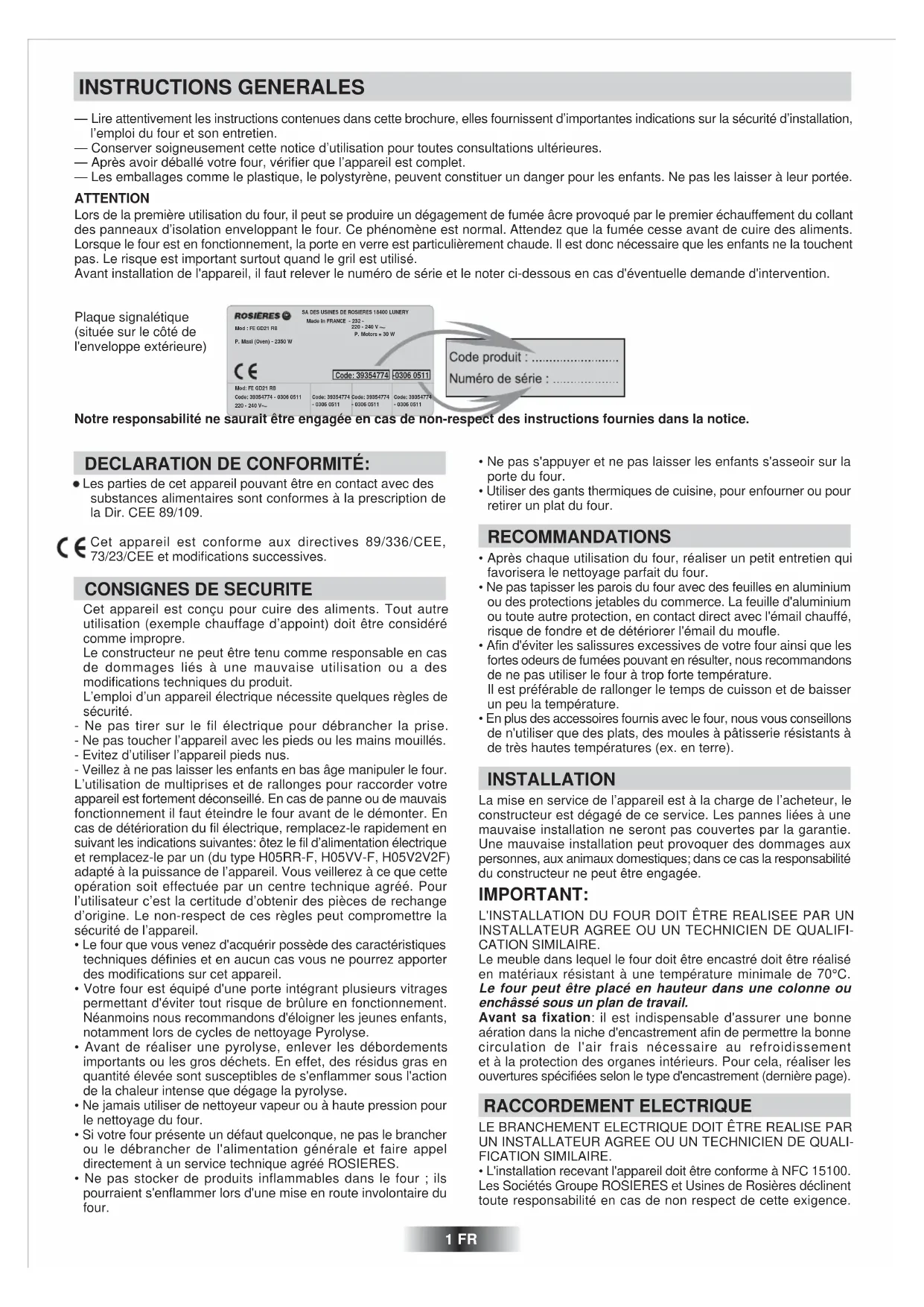- L'installation recevant l'appareil doit être conforme à NFC 15100. Les Sociétés Groupe ROSIERES et Usines de Rosières déclinent toute responsabilité en cas de non respect de cette exigence. SA DES USINES DE ROSIERES 18400 LUNERYMade in FRANCE - 232 -220 - 240 V P. Motors = 30 WMod : FE GD21 RBP. Maxi (Oven) - 2350 WCode: 39354774 -0306 0511Mod: FE GD21 RBCode: 39354774 - 0306 0511220 - 240 VCode: 39354774- 0306 0511Code: 39354774- 0306 0511Code: 39354774- 0306 0511• Le raccordement au réseau doit être effectué par une prise de courant avec prise de terre, ou par l'intermédiaire d'un dispositif à coupure omnipolaire ayant une distance d'ouverture des contacts d'au moins 3 mm.