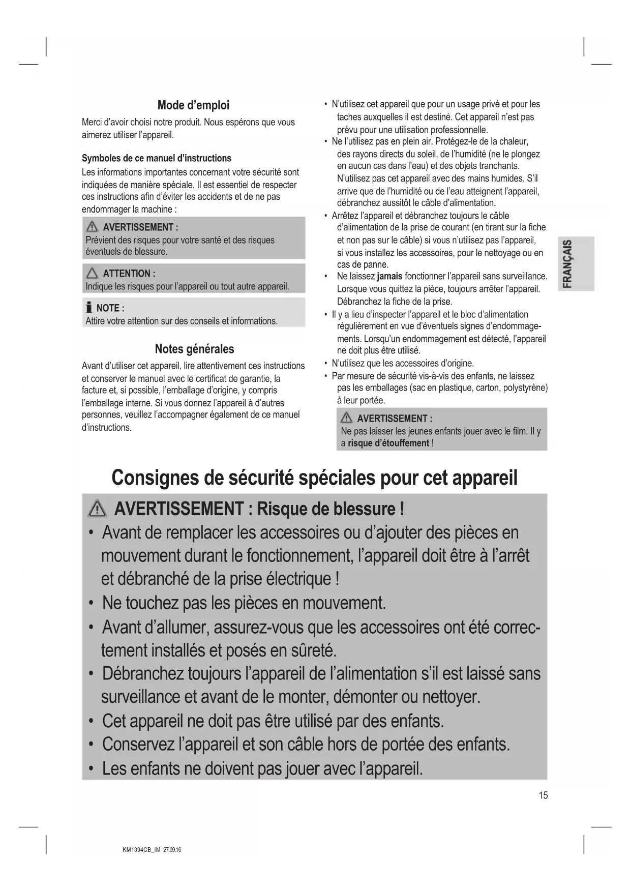 - Les enfants ne doivent pas jouer avec l’appareil.16 KM1394CB_IM 27.09.16