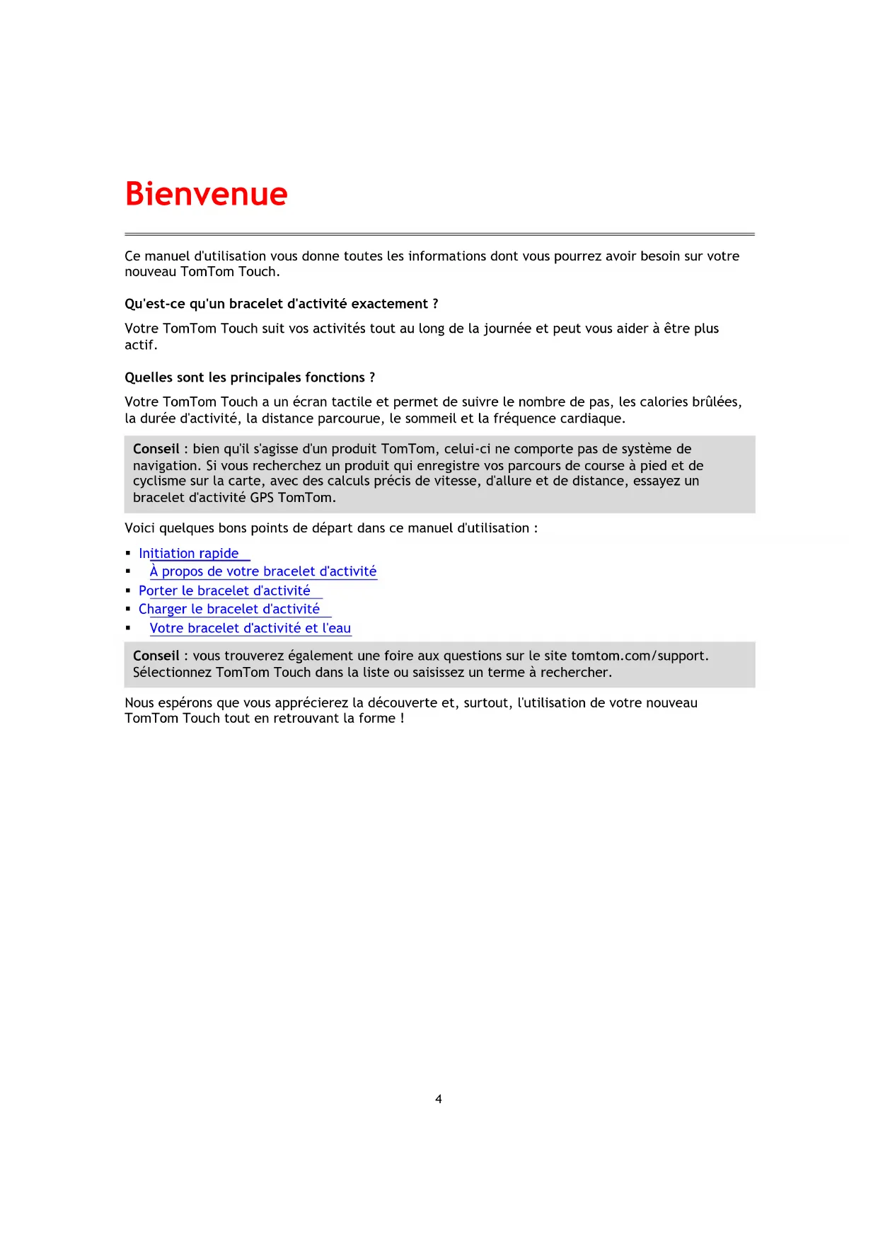Ce manuel d'utilisation vous donne toutes les informations dont vous pourrez avoir besoin sur votre nouveau TomTom Touch. Qu'est-ce qu'un bracelet d'activité exactement ? Votre TomTom Touch suit vos activités tout au long de la journée et peut vous aider à être plus actif. Quelles sont les principales fonctions ? Votre TomTom Touch a un écran tactile et permet de suivre le nombre de pas, les calories brûlées, la durée d'activité, la distance parcourue, le sommeil et la fréquence cardiaque. Conseil : bien qu'il s'agisse d'un produit TomTom, celui-ci ne comporte pas de système de navigation. Si vous recherchez un produit qui enregistre vos parcours de course à pied et de cyclisme sur la carte, avec des calculs précis de vitesse, d'allure et de distance, essayez un bracelet d'activité GPS TomTom. Voici quelques bons points de départ dans ce manuel d'utilisation : Initiation rapide À propos de votre bracelet d'activité Porter le bracelet d'activité Charger le bracelet d'activité Votre bracelet d'activité et l'eau Conseil : vous trouverez également une foire aux questions sur le site tomtom.com/support. Sélectionnez TomTom Touch dans la liste ou saisissez un terme à rechercher. Nous espérons que vous apprécierez la découverte et, surtout, l'utilisation de votre nouveau TomTom Touch tout en retrouvant la forme ! Bienvenue5