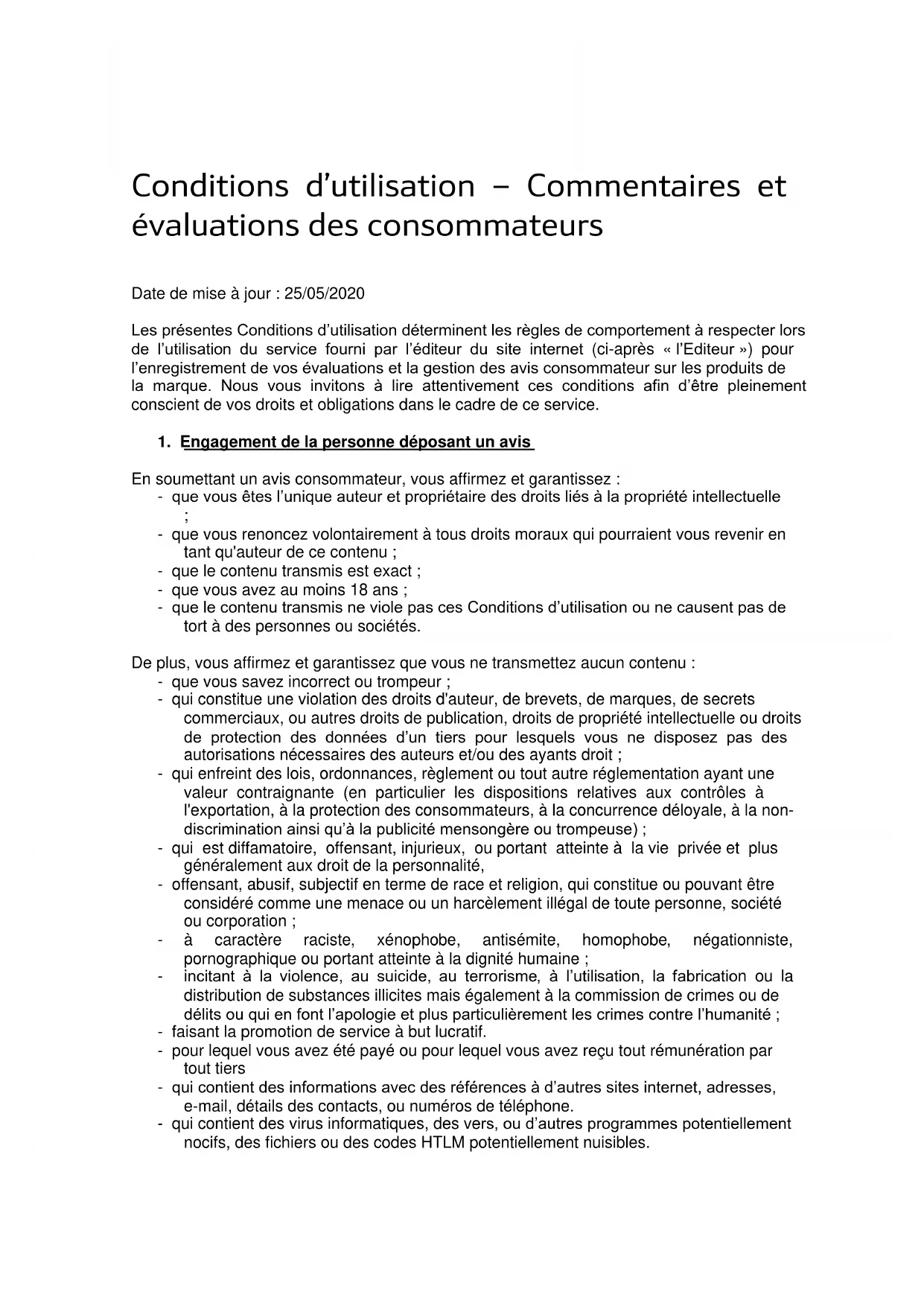 Conditions d’utilisation – Commentaires et évaluations des consommateurs Date de mise à jour : 25/05/2020 Les présentes Conditions d’utilisation déterminent les règles de comportement à respecter lors de l’utilisation du service fourni par l’éditeur du site internet (ci-après « l’Editeur ») pour l’enregistrement de vos évaluations et la gestion des avis consommateur sur les produits de la marque. Nous vous invitons à lire attentivement ces conditions afin d’être pleinement conscient de vos droits et obligations dans le cadre de ce service.