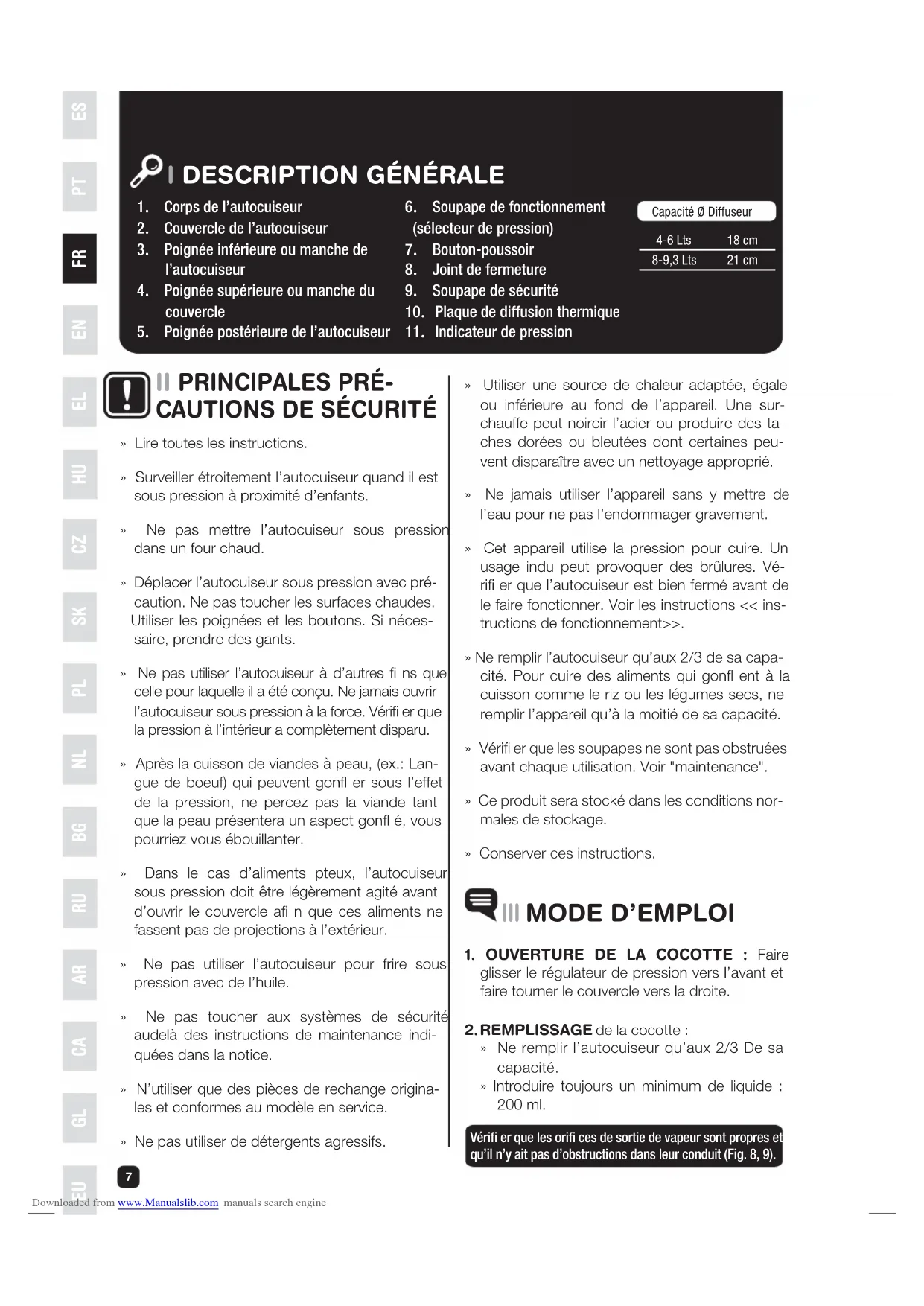 » Ne remplir l’autocuiseur qu’aux 2/3 De sa capacité. » Introduire toujours un minimum de liquide : 200 ml. Vérifi er que les orifi ces de sortie de vapeur sont propres et qu’il n’y ait pas d’obstructions dans leur conduit (Fig. 8, 9).Capacité Ø Diffuseur4-6 Lts8-9,3 Lts18 cm21 cm