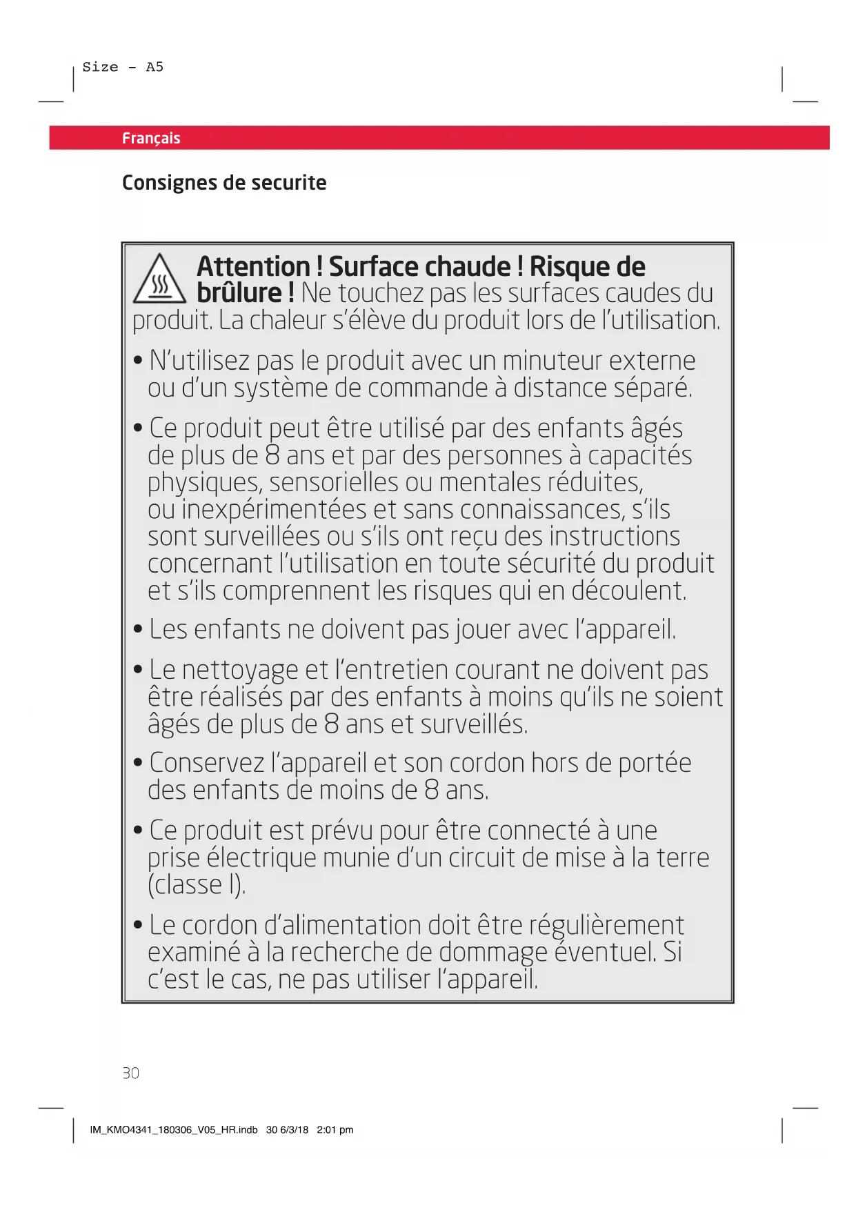 - Le cordon d'alimentation doit être régulièrement examiné à la recherche de dommage éventuel. Si c'est le cas, ne pas utiliser l'appareil. IM_KMO4341_180306_V05_HR.indb 30 6/3/18 2:01 pmFrançais