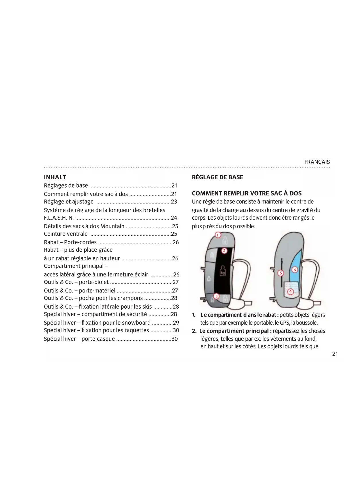 - Spécial hiver – porte-casque FRANÇAIS par ex. l’équipement d’escalade (mousquetons, coinceurs, les broches à glace Express), la tente, les provisions et l’eau, doivent être placés au milieu du sac à dos et près du dos. p. 3022