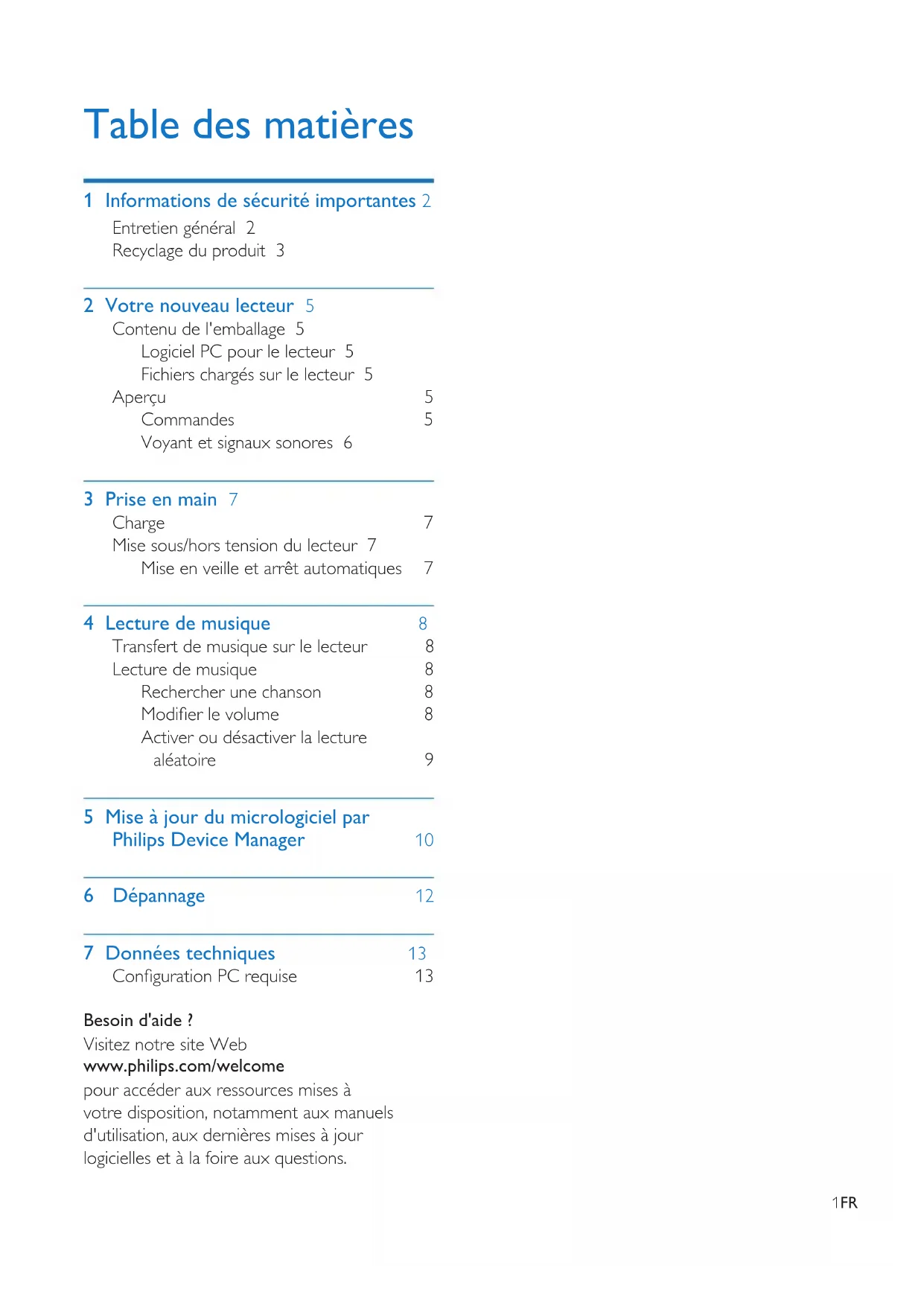 www.philips.com/welcome Mode d'emploi Toujours là pour vous aider Enregistrez votre produit et obtenez de l'assistance sur le site Des questions ? Contactez Philips Des questions ? Contactez Philips SA5DOT GoGEAR1FR Table des matières 1 Informations de sécurité importantes 2 Entretien général 2 Recyclage du produit 3 2 Votre nouveau lecteur 5 Contenu de l'emballage 5 Logiciel PC pour le lecteur 5 Fichiers chargés sur le lecteur 5 Aperçu 5 Commandes 5 Voyant et signaux sonores 6 3 Prise en main 7 Charge 7 Mise sous/hors tension du lecteur 7 Mise en veille et arrêt automatiques 7 4 Lecture de musique 8 Transfert de musique sur le lecteur 8 Lecture de musique 8 Rechercher une chanson 8 Modier le volume 8 Activer ou désactiver la lecture aléatoire 9 5 Mise à jour du micrologiciel par Philips Device Manager 10 6 Dépannage 12 7 Données techniques 13 Conguration PC requise 13 Besoin d'aide ? Visitez notre site Web www.philips.com/welcome pour accéder aux ressources mises à votre disposition, notamment aux manuels d'utilisation, aux dernières mises à jour logicielles et à la foire aux questions.2 FR 1 Informations de sécurité importantes Entretien général La traduction de ce document est fournie à titre indicatif uniquement. En cas d'incohérence entre la version anglaise et la traduction, la version anglaise prévaut. Attention • Pour éviter tout endommagement ou mauvais fonctionnement : • Utilisez uniquement des alimentations indiquées dans le manuel d'utilisation.
