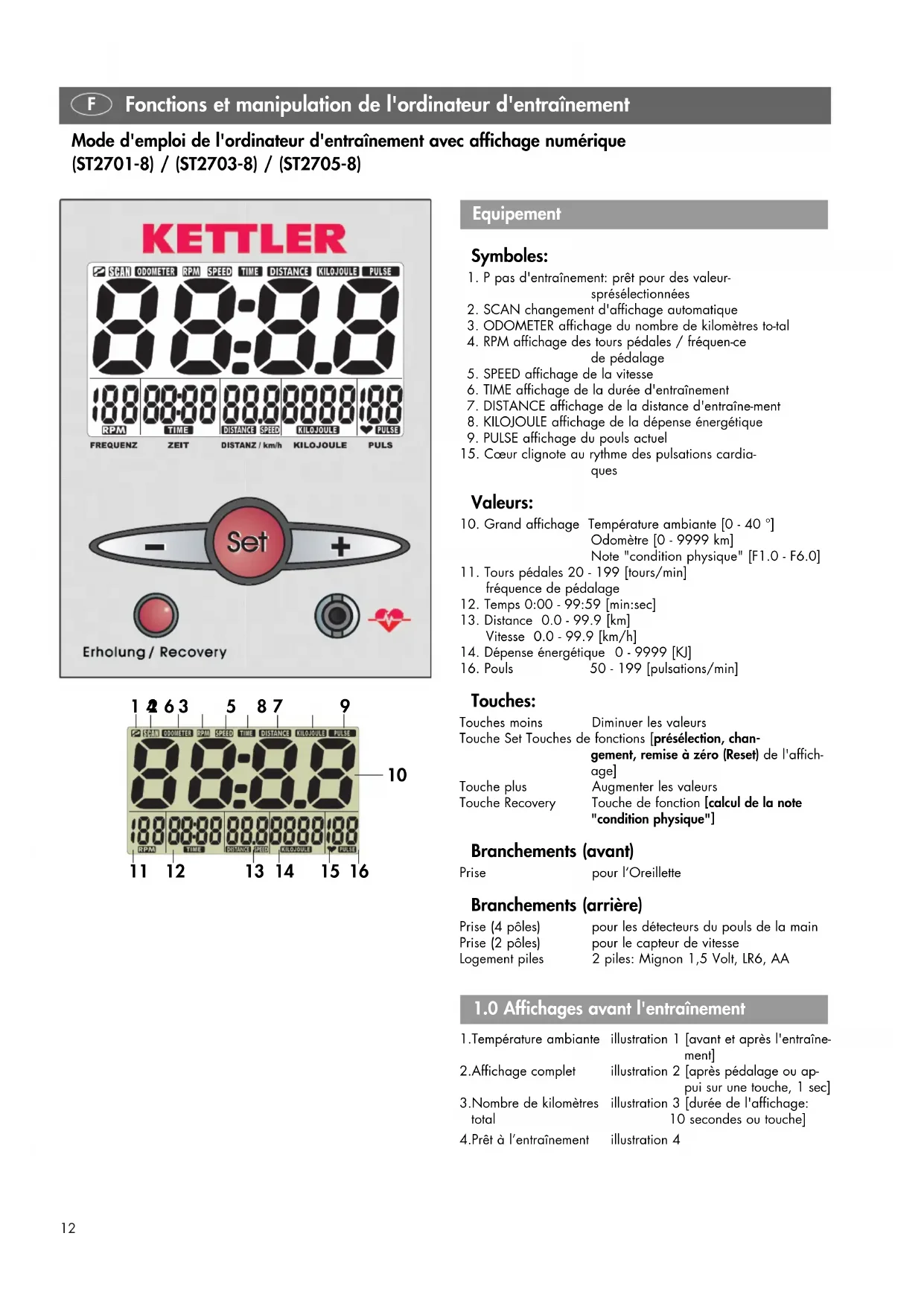 Touches: Touches moins Diminuer les valeurs Touche Set Touches de fonctions [présélection, chan- gement, remise à zéro (Reset) de l'affich- age] Touche plus Augmenter les valeurs Touche Recovery Touche de fonction [calcul de la note "condition physique"] Branchements (avant) Prise pour l’Oreillette Branchements (arrière) Prise (4 pôles) pour les détecteurs du pouls de la main Prise (2 pôles) pour le capteur de vitesse Logement piles 2 piles: Mignon 1,5 Volt, LR6, AA 1.Température ambiante illustration 1 [avant et après l'entraîne- ment] 2.Affichage complet illustration 2 [après pédalage ou ap- pui sur une touche, 1 sec] 3.Nombre de kilomètres illustration 3 [durée de l'affichage: total 10 secondes ou touche] 4.Prêt à l’entraînement illustration 4