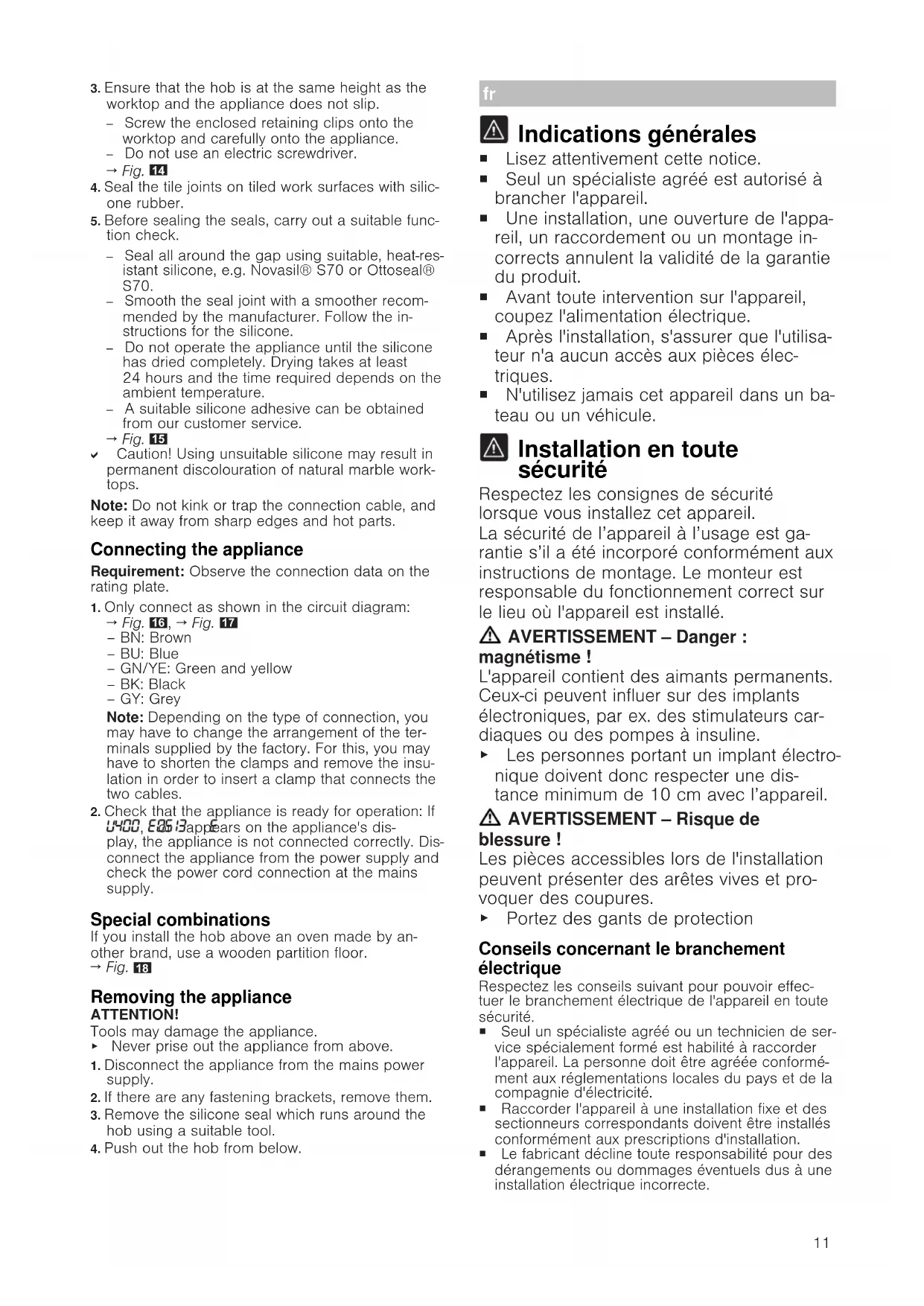 Indications générales ¡ Lisez attentivement cette notice. ¡ Seul un spécialiste agréé est autorisé à brancher l'appareil. ¡ Une installation, une ouverture de l'appa- reil, un raccordement ou un montage in- corrects annulent la validité de la garantie du produit. ¡ Avant toute intervention sur l'appareil, coupez l'alimentation électrique. ¡ Après l'installation, s'assurer que l'utilisa- teur n'a aucun accès aux pièces élec- triques. ¡ N'utilisez jamais cet appareil dans un ba- teau ou un véhicule. Installation en toute sécurité Respectez les consignes de sécurité lorsque vous installez cet appareil. La sécurité de l’appareil à l’usage est ga- rantie s’il a été incorporé conformément aux instructions de montage. Le monteur est responsable du fonctionnement correct sur le lieu où l'appareil est installé. AVERTISSEMENT‒Danger: magnétisme! L'appareil contient des aimants permanents. Ceux-ci peuvent influer sur des implants électroniques, par ex. des stimulateurs car- diaques ou des pompes à insuline. ▶ Les personnes portant un implant électro- nique doivent donc respecter une dis- tance minimum de 10cm avec l’appareil. AVERTISSEMENT‒Risque de blessure! Les pièces accessibles lors de l'installation peuvent présenter des arêtes vives et pro- voquer des coupures. ▶ Portez des gants de protection Conseils concernant le branchement électrique Respectez les conseils suivant pour pouvoir effec- tuer le branchement électrique de l'appareil en toute sécurité. ¡ Seul un spécialiste agréé ou un technicien de ser- vice spécialement formé est habilité à raccorder l'appareil. La personne doit être agréée conformé- ment aux réglementations locales du pays et de la compagnie d'électricité. ¡ Raccorder l'appareil à une installation fixe et des sectionneurs correspondants doivent être installés conformément aux prescriptions d'installation. ¡ Le fabricant décline toute responsabilité pour des dérangements ou dommages éventuels dus à une installation électrique incorrecte.12 Type de connexion ¡ Cet appareil est conforme à la classe de protec- tion 1. Par conséquent, utiliser l'appareil unique- ment avec une prise à conducteur de protection. Cordon d'alimentation Le cordon d'alimentation peut être raccordé à la prise de raccordement de la table de cuisson ou être joint à l'appareil. ¡ Vous trouverez les valeurs de raccordement re- quises sur la plaque signalétique et sur le schéma de raccordement. ¡ Utiliser uniquement le câble de raccordement fourni avec l'appareil ou fourni par le service après-vente. Si vous avez besoin d'un câble plus long, contactez le service après-vente. Des cor- dons d'alimentation secteur jusqu'à 2,20 m de lon- gueur sont disponibles. Conseils concernant les meubles d'encastrement ¡ Vous pouvez installer la table à induction unique- ment via des tiroirs ou des fours à ventilation for- cée. Ne pas installer de réfrigérateur, de lave-vais- selle, de four non ventilé ou de lave-linge sous la table de cuisson. ¡ S'assurer que les meubles d'encastrement ré- sistent à la chaleur jusqu'au moins 90°C. Plan de travail Respecter les recommandations du fabricant du plan de travail. ¡ À plat, à l'horizontale, stable. ¡ Le plan de travail dans lequel vous intégrez l'ap- pareil doit pouvoir supporter une charge d'environ 60kg. ¡ Pour des plans de travail minces, utiliser un maté- riau de renforcement résistant à la chaleur et á l'humidité. ¡ Vérifier la planéité de la table de cuisson une fois qu'elle est montée. ¡ Vous pouvez intégrer l'appareil dans les plans de travail résistants aux températures élevées et étanches suivants : – Plans de travail en marbre, pierre naturelle. – Plans de travail en matière plastique. – Plans de travail en bois massif, uniquement avec l'accord du fabricant du plan de travail, sceller les bords de coupe. – D'autres plans de travail, uniquement avec l'ac- cord du fabricant du plan de travail. ¡ Pour aligner l'appareil, ne pas utiliser de supports à des points individuels. ¡ Les travaux de découpe sur le plan de travail doivent être effectués par une entreprise spéciali- sée conformément au croquis de montage. L'arête de coupe doit être propre et précise car le bord est visible sur la surface. Nettoyer et dégraisse´r les arêtes de coupe à l'aide d'un détergent adap- té. Hotte ¡ La distance entre la hotte et la table de cuisson doit être au moins égale à la distance indiquée dans les instructions de montage de la hotte. Préparation des meubles d'encastrement