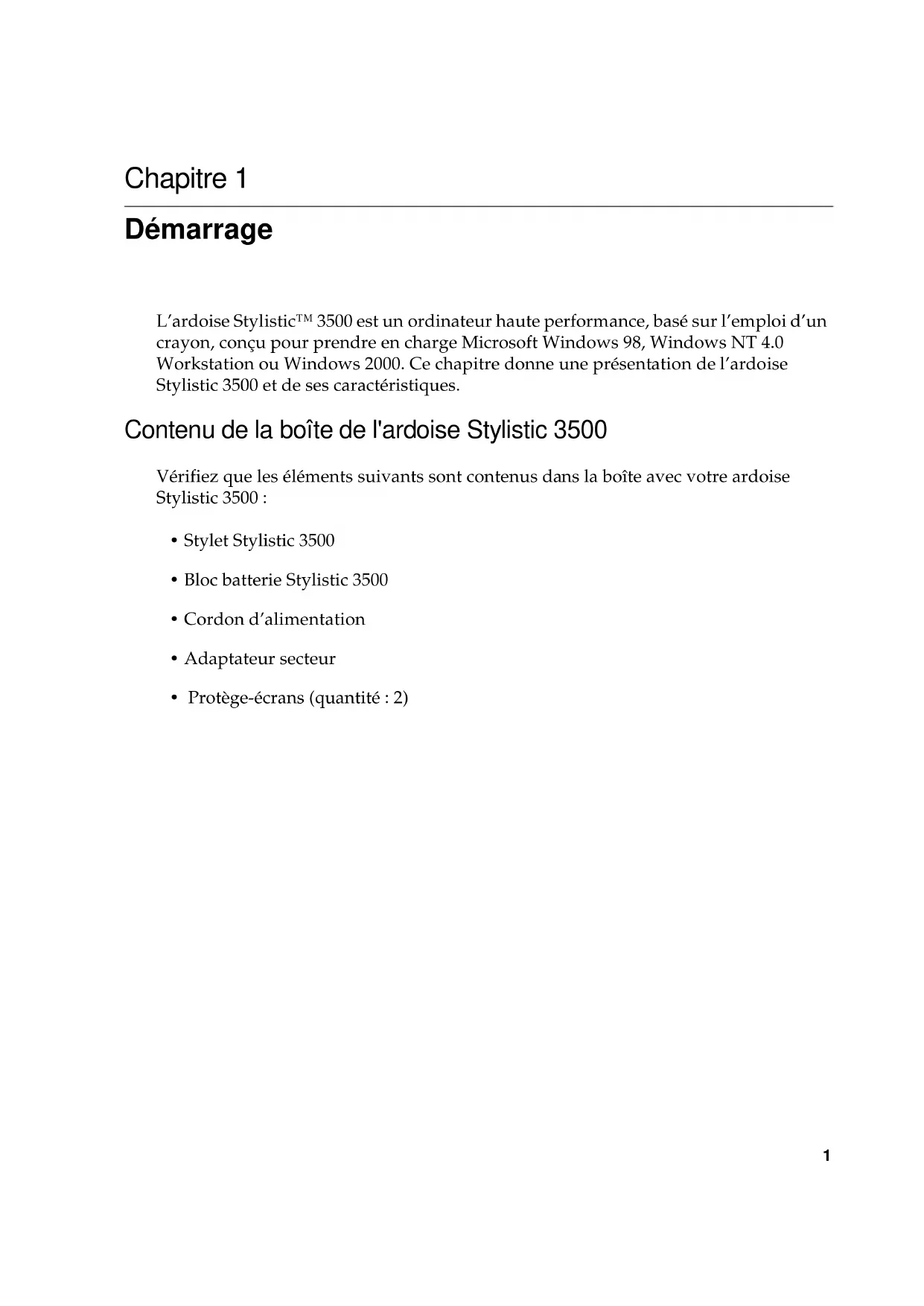Démarrage L’ardoise Stylistic™ 3500 est un ordinateur haute performance, basé sur l’emploi d’un crayon, conçu pour prendre en charge Microsoft Windows 98, Windows NT 4.0 Workstation ou Windows 2000. Ce chapitre donne une présentation de l’ardoise Stylistic 3500 et de ses caractéristiques. Contenu de la boîte de l'ardoise Stylistic 3500 1 Vérifiez que les éléments suivants sont contenus dans la boîte avec votre ardoise Stylistic 3500 :