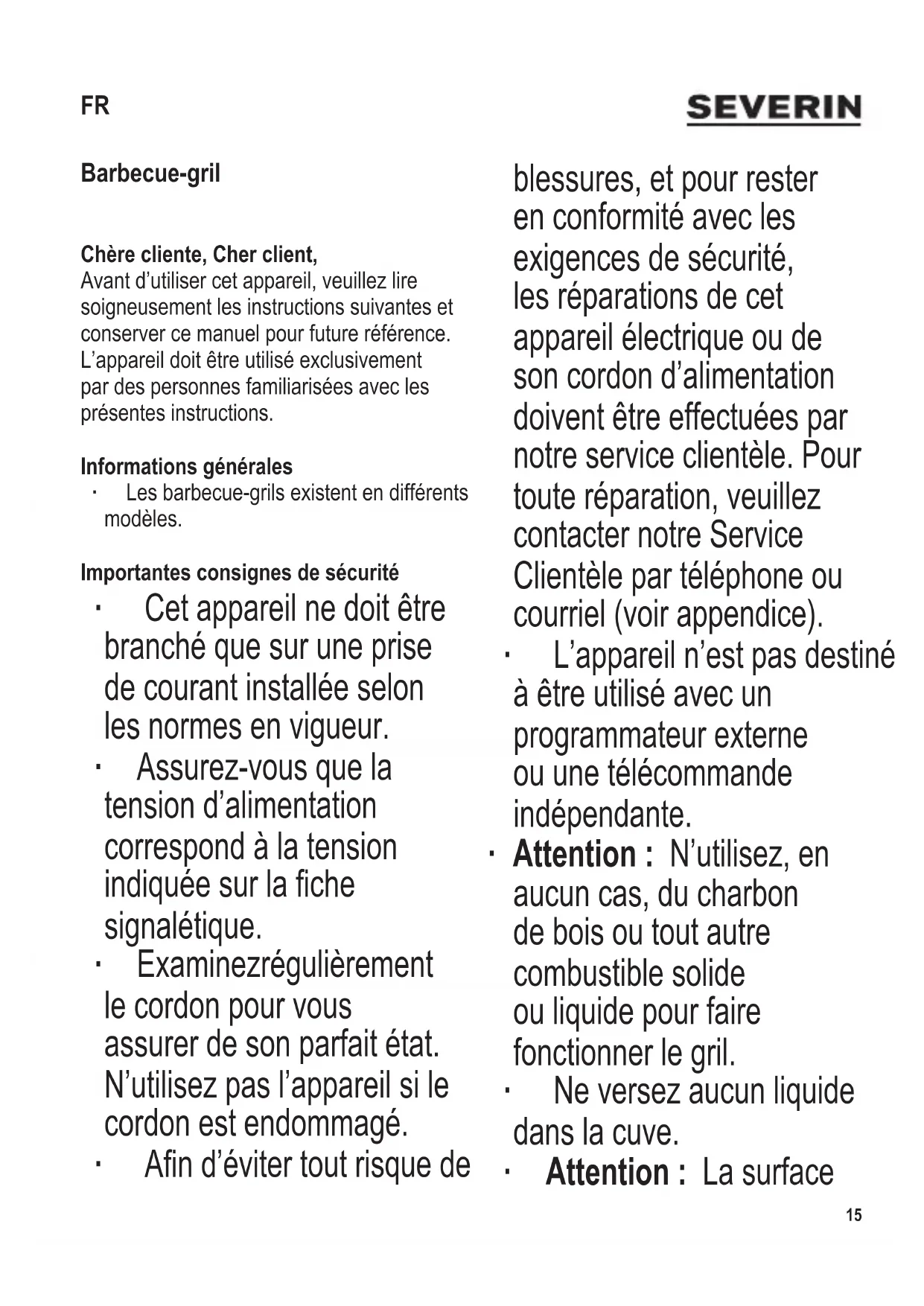 Barbecue-gril Chère cliente, Cher client, Avant d’utiliser cet appareil, veuillez lire soigneusement les instructions suivantes et conserver ce manuel pour future référence. L’appareil doit être utilisé exclusivement par des personnes familiarisées avec les présentes instructions. Informations générales ∙ Les barbecue-grils existent en différents modèles. Importantes consignes de sécurité ∙ Cet appareil ne doit être branché que sur une prise de courant installée selon les normes en vigueur. ∙ Assurez-vous que la tension d’alimentation correspond à la tension indiquée sur la che signalétique. ∙ Examinez régulièrement le cordon pour vous assurer de son parfait état. N’utilisez pas l’appareil si le cordon est endommagé. ∙ An d’éviter tout risque de blessures, et pour rester en conformité avec les exigences de sécurité, les réparations de cet appareil électrique ou de son cordon d’alimentation doivent être effectuées par notre service clientèle. Pour toute réparation, veuillez contacter notre Service Clientèle par téléphone ou courriel (voir appendice). ∙ L’appareil n’est pas destiné à être utilisé avec un programmateur externe ou une télécommande indépendante. ∙ Attention : N’utilisez, en aucun cas, du charbon de bois ou tout autre combustible solide ou liquide pour faire fonctionner le gril. ∙ Ne versez aucun liquide dans la cuve. ∙ Attention : La surface FR16 104 x 142 mm de cuisson et les surfaces extérieures accessibles deviennent très chaudes pendant le fonctionnement. Ne touchez aucune pièce de l’appareil à l’exception des poignées encastrées pendant et après l’utilisation. ∙ Avant de nettoyer le barbecue-gril, débranchez- le du secteur et laissez totalement refroidir le gril. ∙ Pour éviter tout risque de choc électrique, la boîte de dérivation et le cordon d’alimentation ne doivent pas être nettoyés à l’eau ni plongés dans un liquide. ∙ Nettoyez la grille de cuisson à l’eau savonneuse, puis séchez soigneusement. Assurez- vous que la grille de cuisson est absolument sèche, surtout du côté de la boîte de dérivation, avant d’utiliser à nouveau le barbecue-gril. ∙ Pour des informations détaillées concernant le nettoyage de l’appareil, veuillez vous référer au paragraphe Entretien et nettoyage. ∙ Cet appareil est destiné à être utilisé dans des applications domestiques et analogues telles que : - des coins cuisines réservés au personnel dans des magasins, bureaux et autres environnements professionnels ; - des fermes ; - l’utilisation par les clients des hôtels, motels et autres environnements à caractère résidentiel ; - des environnements de type chambres d’hôtes.104 x 142 mm