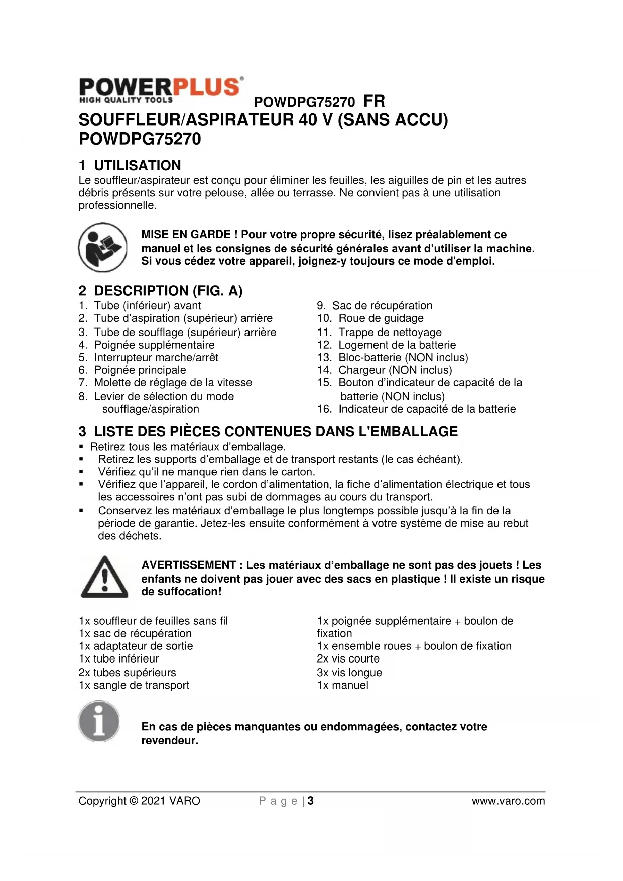 enfants ne doivent pas jouer avec des sacs en plastique ! Il existe un risque de suffocation! 1x souffleur de feuilles sans fil 1x sac de récupération 1x adaptateur de sortie 1x tube inférieur 2x tubes supérieurs 1x sangle de transport 1x poignée supplémentaire + boulon de fixation 1x ensemble roues + boulon de fixation 2x vis courte 3x vis longue 1x manuel En cas de pièces manquantes ou endommagées, contactez votre revendeur.POWDPG75270 FR Copyright © 2021 VARO P a g e | 4 www.varo.com 4 PICTOGRAMMES Les symboles suivants sont utilisés dans ce mode d’emploi et/ou sur la machine: