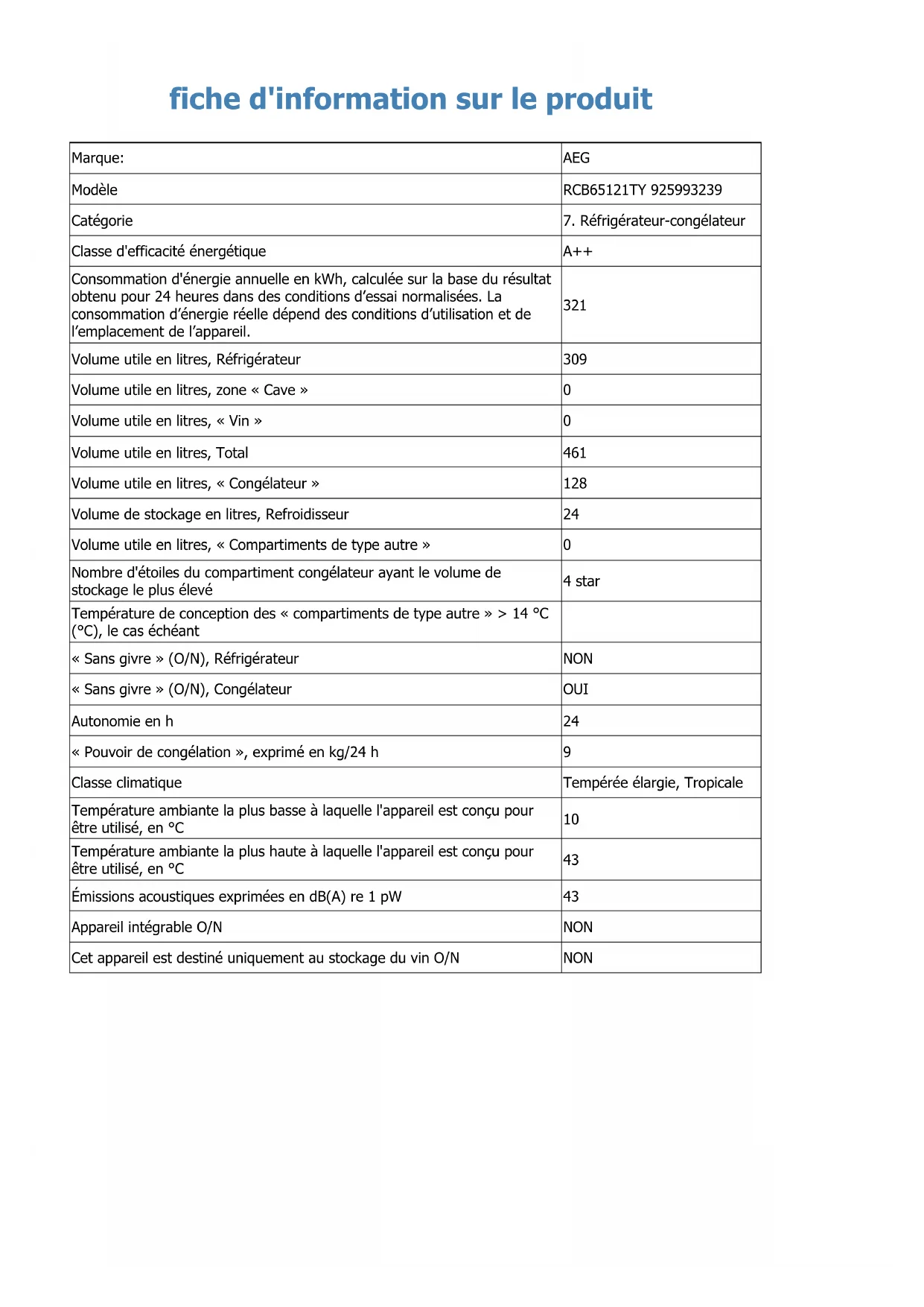 Nombre d'étoiles du compartiment congélateur ayant le volume de stockage le plus élevé 4 star Température de conception des « compartiments de type autre » > 14 °C (°C), le cas échéant « Sans givre » (O/N), Réfrigérateur NON « Sans givre » (O/N), Congélateur OUI Autonomie en h