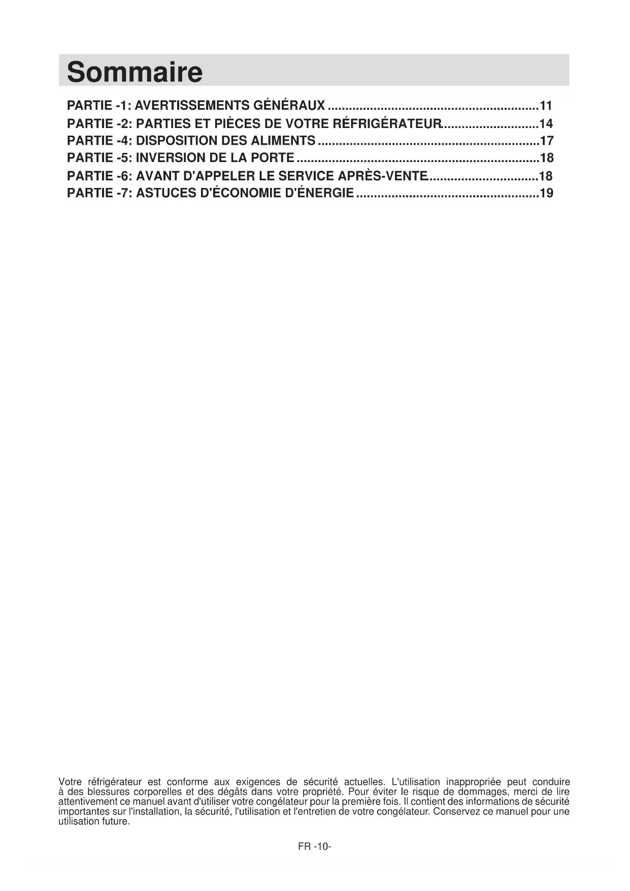 Votre réfrigérateur est conforme aux exigences de sécurité actuelles. L'utilisation inappropriée peut conduire à des blessures corporelles et des dégâts dans votre propriété. Pour éviter le risque de dommages, merci de lire attentivement ce manuel avant d'utiliser votre congélateur pour la première fois. Il contient des informations de sécurité importantes sur l'installation, la sécurité, l'utilisation et l'entretien de votre congélateur. Conservez ce manuel pour une utilisation future. Sommaire