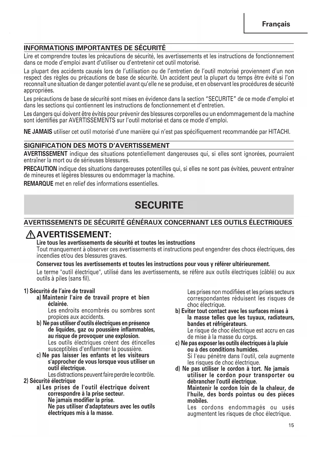 Lire et comprendre toutes les précautions de sécurité, les avertissements et les instructions de fonctionnement dans ce mode d’emploi avant d’utiliser ou d’entretenir cet outil motorisé. La plupart des accidents causés lors de l’utilisation ou de l’entretien de l’outil motorisé proviennent d’un non respect des règles ou précautions de base de sécurité. Un accident peut la plupart du temps être évité si l’on reconnaît une situation de danger potentiel avant qu’elle ne se produise, et en observant les procédures de sécurité appropriées. Les précautions de base de sécurité sont mises en évidence dans la section “SECURITE” de ce mode d’emploi et dans les sections qui contiennent les instructions de fonctionnement et d’entretien. Les dangers qui doivent être évités pour prévenir des blessures corporelles ou un endommagement de la machine sont identifiés par AVERTISSEMENTS sur l’outil motorisé et dans ce mode d’emploi. NE JAMAIS utiliser cet outil motorisé d’une manière qui n’est pas spécifiquement recommandée par HITACHI.