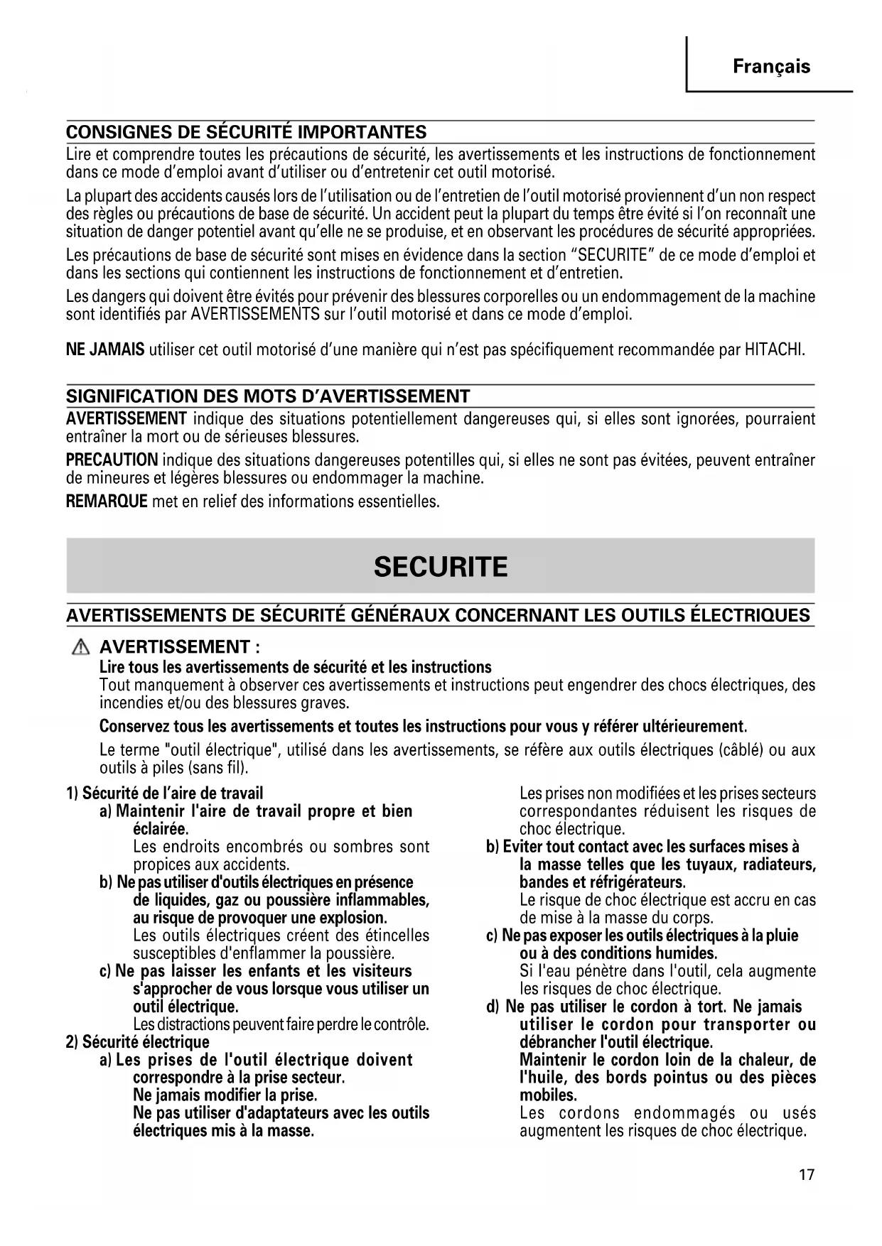 Lire et comprendre toutes les précautions de sécurité, les avertissements et les instructions de fonctionnement dans ce mode d’emploi avant d’utiliser ou d’entretenir cet outil motorisé. La plupart des accidents causés lors de l’utilisation ou de l’entretien de l’outil motorisé proviennent d’un non respect des règles ou précautions de base de sécurité. Un accident peut la plupart du temps être évité si l’on reconnaît une situation de danger potentiel avant qu’elle ne se produise, et en observant les procédures de sécurité appropriées. Les précautions de base de sécurité sont mises en évidence dans la section “SECURITE” de ce mode d’emploi et dans les sections qui contiennent les instructions de fonctionnement et d’entretien. Les dangers qui doivent être évités pour prévenir des blessures corporelles ou un endommagement de la machine sont identifiés par AVERTISSEMENTS sur l’outil motorisé et dans ce mode d’emploi. NE JAMAIS utiliser cet outil motorisé d’une manière qui n’est pas spécifiquement recommandée par HITACHI.