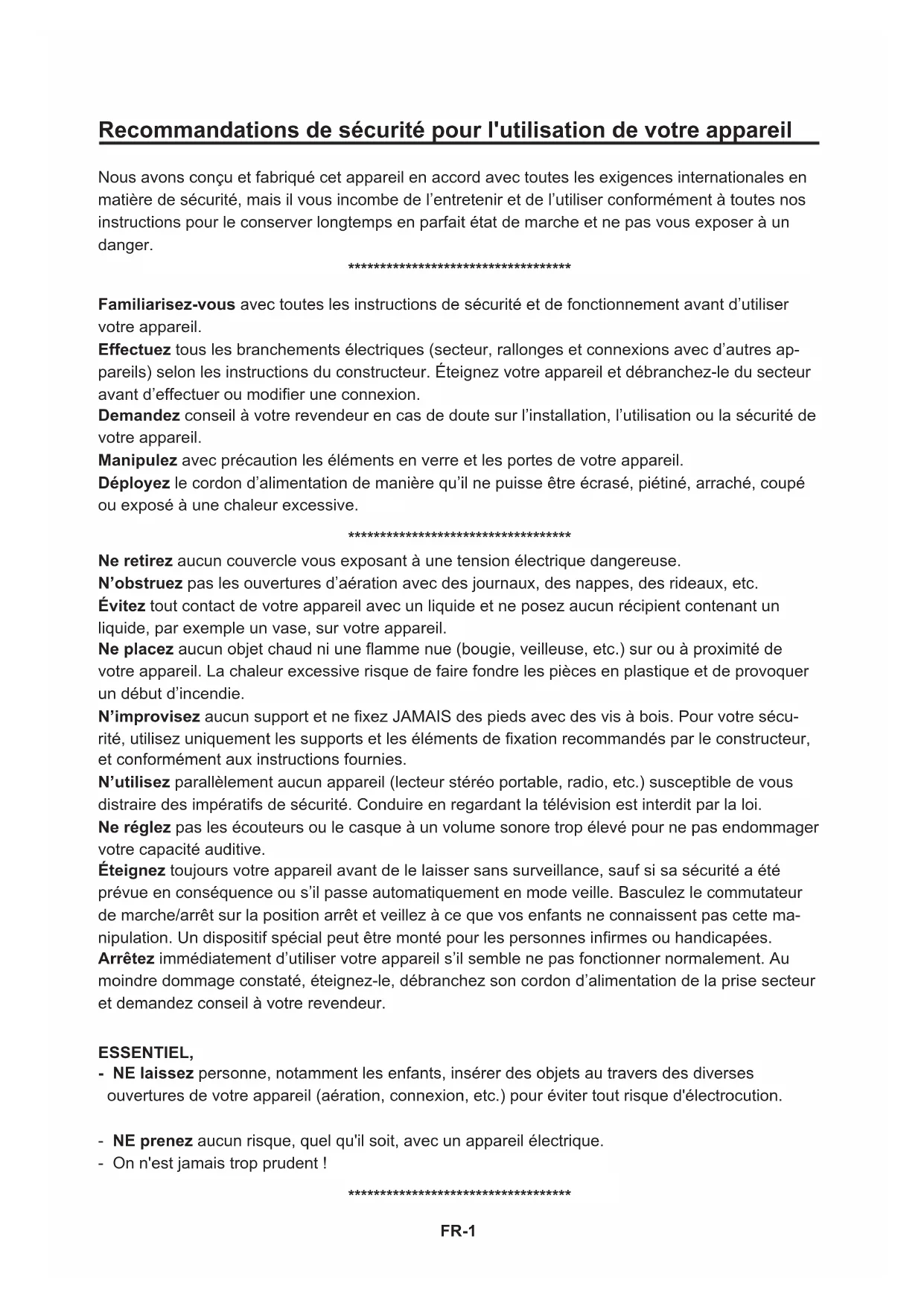 Ne retirez aucun couvercle vous exposant à une tension électrique dangereuse. N’obstruez pas les ouvertures d’aération avec des journaux, des nappes, des rideaux, etc. Évitez tout contact de votre appareil avec un liquide et ne posez aucun récipient contenant un liquide, par exemple un vase, sur votre appareil. Ne placez aucun objet chaud ni une amme nue (bougie, veilleuse, etc.) sur ou à proximité de votre appareil. La chaleur excessive risque de faire fondre les pièces en plastique et de provoquer un début d’incendie. N’improvisez aucun support et ne xez JAMAIS des pieds avec des vis à bois. Pour votre sécu- rité, utilisez uniquement les supports et les éléments de xation recommandés par le constructeur, et conformément aux instructions fournies. N’utilisez parallèlement aucun appareil (lecteur stéréo portable, radio, etc.) susceptible de vous distraire des impératifs de sécurité. Conduire en regardant la télévision est interdit par la loi. Ne réglez pas les écouteurs ou le casque à un volume sonore trop élevé pour ne pas endommager votre capacité auditive. Éteignez toujours votre appareil avant de le laisser sans surveillance, sauf si sa sécurité a été prévue en conséquence ou s’il passe automatiquement en mode veille. Basculez le commutateur de marche/arrêt sur la position arrêt et veillez à ce que vos enfants ne connaissent pas cette ma- nipulation. Un dispositif spécial peut être monté pour les personnes inrmes ou handicapées. Arrêtez immédiatement d’utiliser votre appareil s’il semble ne pas fonctionner normalement. Au moindre dommage constaté, éteignez-le, débranchez son cordon d’alimentation de la prise secteur et demandez conseil à votre revendeur. ESSENTIEL, - NE laissez personne, notamment les enfants, insérer des objets au travers des diverses ouvertures de votre appareil (aération, connexion, etc.) pour éviter tout risque d'électrocution. - NE prenez aucun risque, quel qu'il soit, avec un appareil électrique. - On n'est jamais trop prudent !