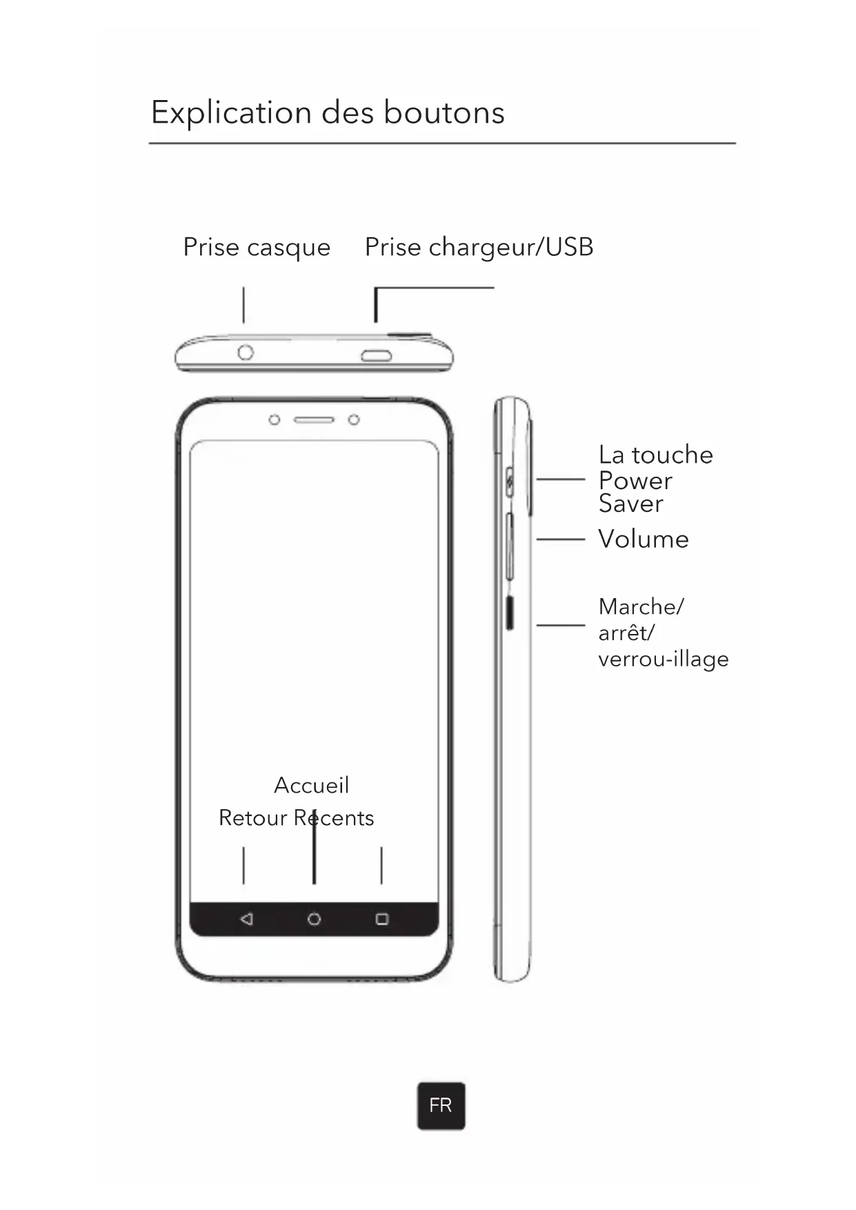 Prise casque La touche Power Saver Volume Marche/ arrêt/ verrou-illage Prise chargeur/USB Accueil Retour RécentsFR Bouton Fonction La touche Power Saver