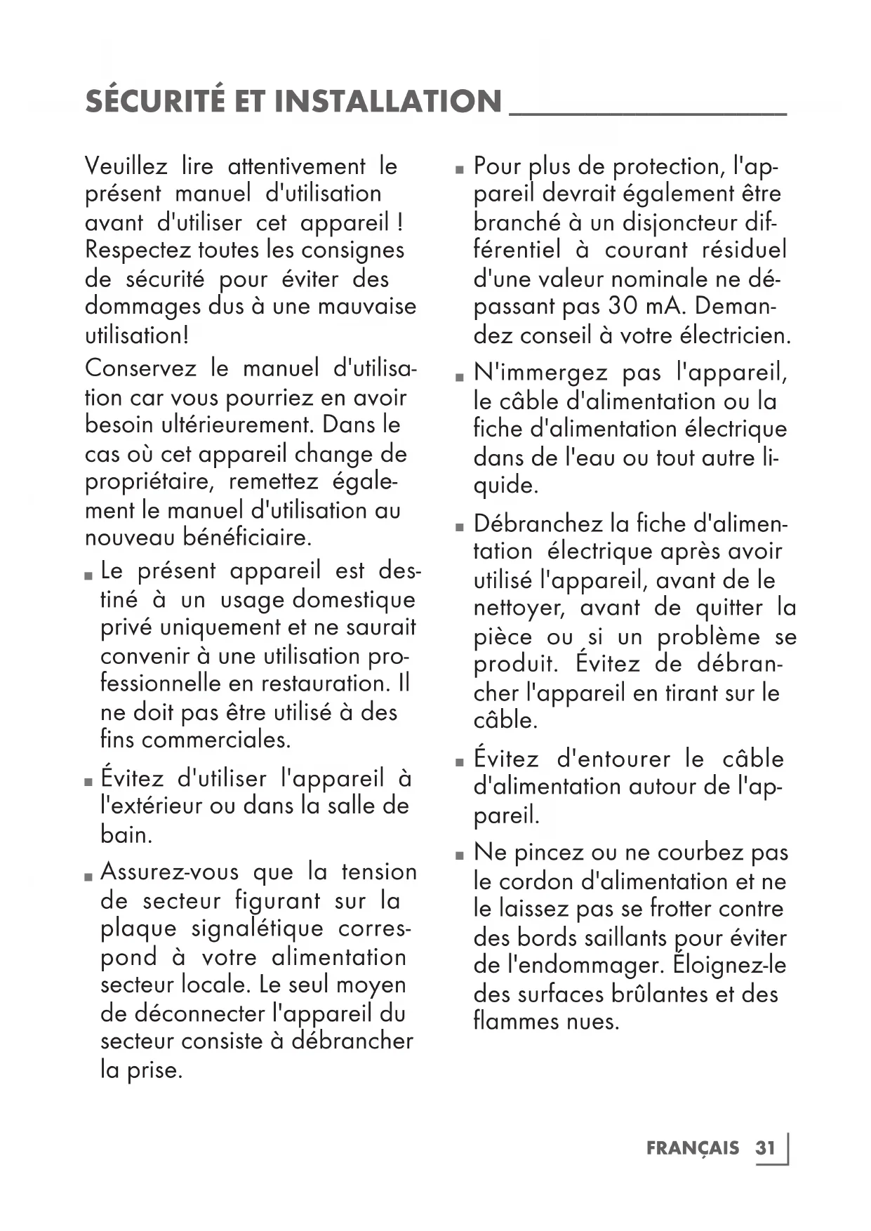 Le présent appareil est des- tiné à un usage domestique privé uniquement et ne saurait convenir à une utilisation pro- fessionnelle en restauration. Il ne doit pas être utilisé à des fins commerciales.
