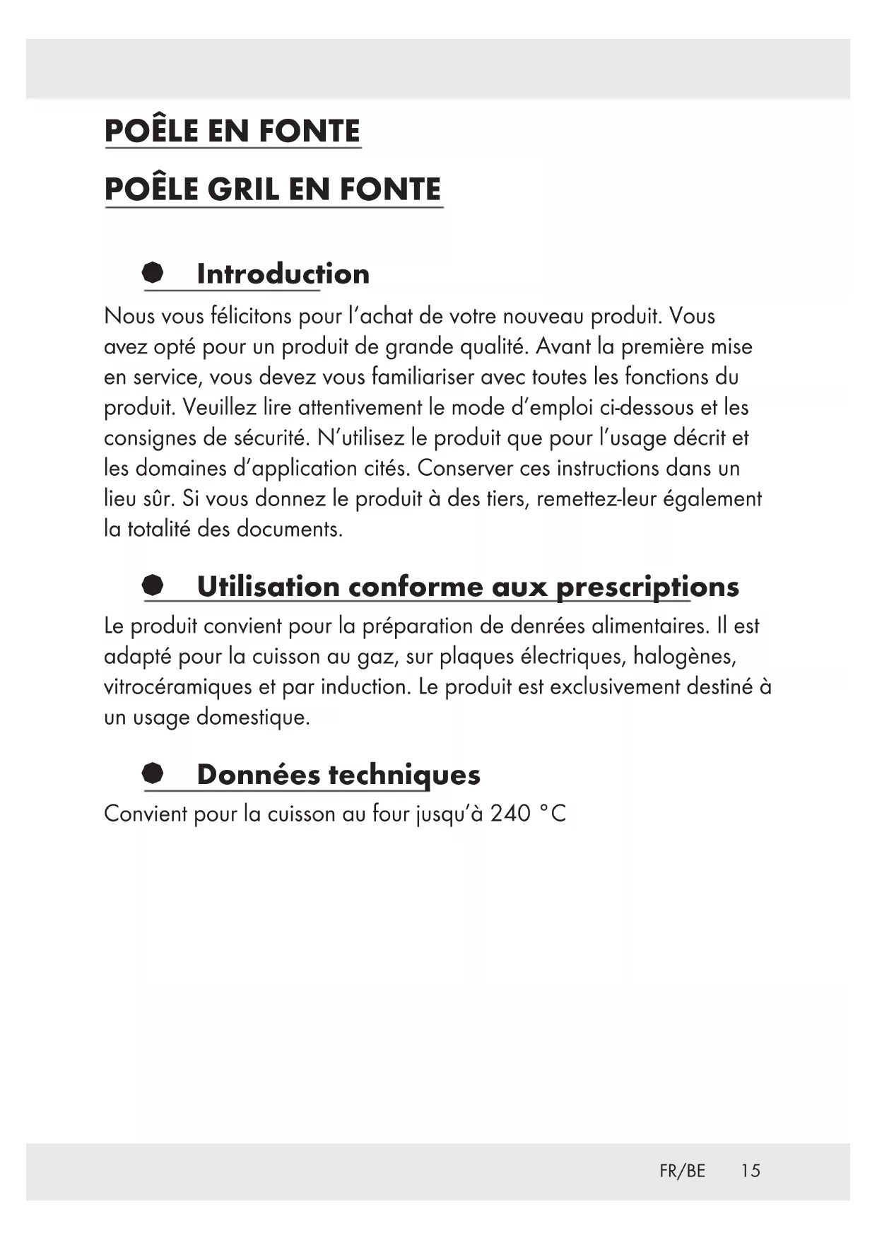 § Introduction Nous vous félicitons pour l‘achat de votre nouveau produit. Vous avez opté pour un produit de grande qualité. Avant la première mise en service, vous devez vous familiariser avec toutes les fonctions du produit. Veuillez lire attentivement le mode d’emploi ci-dessous et les consignes de sécurité. N’utilisez le produit que pour l’usage décrit et les domaines d’application cités. Conserver ces instructions dans un lieu sûr. Si vous donnez le produit à des tiers, remettez-leur également la totalité des documents. § Utilisation conforme aux prescriptions Le produit convient pour la préparation de denrées alimentaires. Il est adapté pour la cuisson au gaz, sur plaques électriques, halogènes, vitrocéramiques et par induction. Le produit est exclusivement destiné à un usage domestique. § Données techniques Convient pour la cuisson au four jusqu’à 240 °C16 FR/BE Consignes de sécurité CONSERVEZ TOUTES LES CONSIGNES DE SÉCURITÉ ET INSTRUCTIONS POUR VOUS Y REPORTER ULTÉRIEUREMENT!