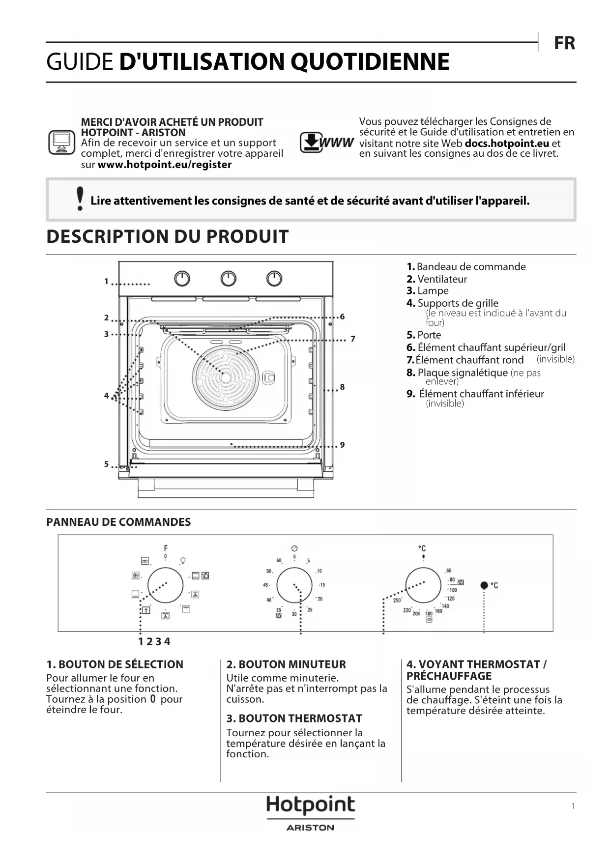 PRÉCHAUFFAGE S'allume pendant le processus de chauffage. S'éteint une fois la température désirée atteinte.MERCI D'AVOIR ACHETÉ UN PRODUIT HOTPOINT - ARISTONAfin de recevoir un service et un support complet, merci d'enregistrer votre appareil sur www.hotpoint.eu/register WWW Vous pouvez télécharger les Consignes de sécurité et le Guide d'utilisation et entretien en visitant notre site Web docs.hotpoint.eu et en suivant les consignes au dos de ce livret.