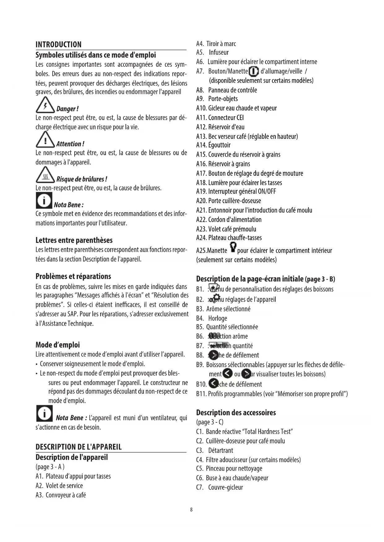 Description de l'appareil (page 3 - A ) A1. Plateau d’appui pour tasses A2. Volet de service A3. Convoyeur à café A4. Tiroir à marc A5. Infuseur A6. Lumière pour éclairer le compartiment interne A7. Bouton/Manette d’allumage/veille / (disponible seulement sur certains modèles) A8. Panneau de contrôle A9. Porte-objets A10. Gicleur eau chaude et vapeur A11. Connecteur CEI A12. Réservoir d'eau A13. Bec verseur café (réglable en hauteur) A14. Égouttoir A15. Couvercle du réservoir à grains A16. Réservoir à grains A17. Bouton de réglage du degré de mouture A18. Lumière pour éclairer les tasses A19. Interrupteur général ON/OFF A20. Porte cuillère-doseuse A21. Entonnoir pour l'introduction du café moulu A22. Cordon d'alimentation A23. Volet café prémoulu A24. Plateau chauffe-tasses A25.Manette pour éclairer le compartiment intérieur (seulement sur certains modèles) Description de la page-écran initiale (page 3 - B) B1. : menu de personnalisation des réglages des boissons B2. : menu réglages de l’appareil B3. Arôme sélectionné B4. Horloge B5. Quantité sélectionnée B6. : sélection arôme B7. : sélection quantité B8. : èche de délement B9. Boissons sélectionnables (appuyer sur les èches de déle- ment ou pour visualiser toutes les boissons) B10. : èche de délement B11. Prols programmables (voir “Mémoriser son propre prol”) Description des accessoires (page 3 - C) C1. Bande réactive “Total Hardness Test” C2. Cuillère-doseuse pour café moulu C3. Détartrant C4. Filtre adoucisseur (sur certains modèles) C5. Pinceau pour nettoyage C6. Buse à eau chaude/vapeur C7. Couvre-gicleur9 Description du pot à lait (page 3 - D) D1. Bouton de réglage de la mousse et de NETTOYAGE D2 Couvercle avec mousseur à lait D3. Pot à lait D4. Tube de prise du lait D5. Buse réglable du lait mousseux D6. Revêtement thermique D7. Boutons de décrochage du couvercle