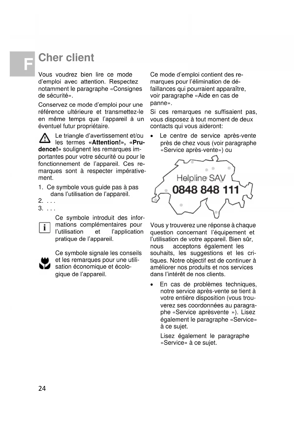 - Vous y trouverez une réponse à chaque question concernant l’équipement et l’utilisation de votre appareil. Bien sûr, nous acceptons également les souhaits, les suggestions et les cri- tiques. Notre objectif est de continuer à améliorer nos produits et nos services dans l’intérêt de nos clients. En cas de problèmes techniques, notre service après-vente se tient à votre entière disposition (vous trou- verez ses coordonnées au paragra- phe «Service aprèsvente »). Lisez également le paragraphe «Service» à ce sujet. Lisez également le paragraphe «Service» à ce sujet. F25 Sommaire Consignes de sécurité p. 26
