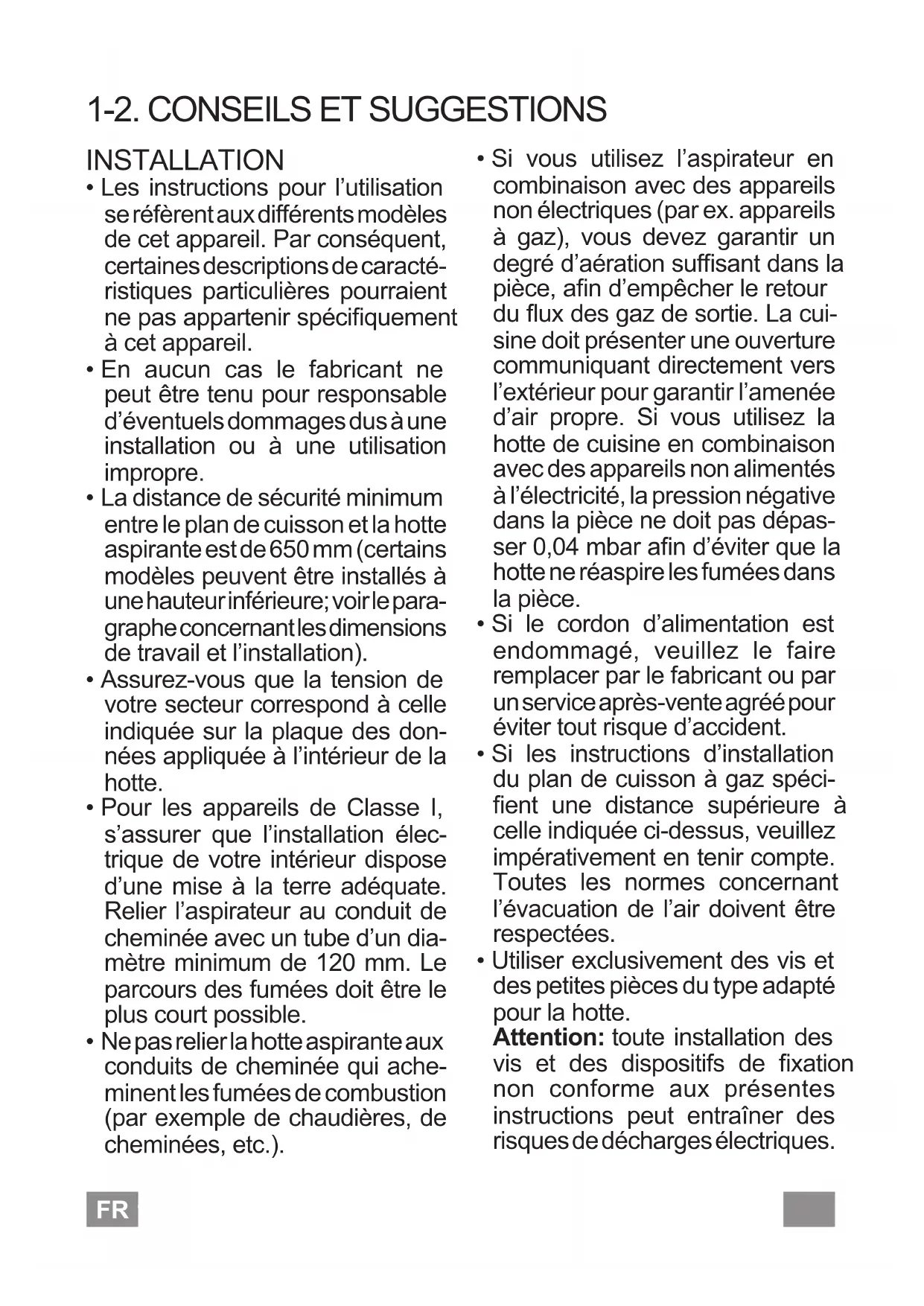 - Utiliser exclusivement des vis et des petites pièces du type adapté pour la hotte. Attention: toute installation des vis et des dispositifs de xation non conforme aux présentes instructions peut entraîner des risques de décharges électriques.FR 12