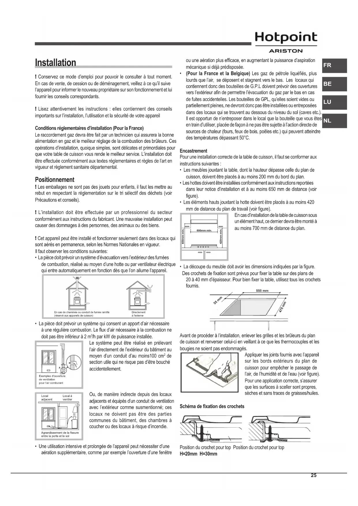 Installation ! Conservez ce mode d’emploi pour pouvoir le consulter à tout moment. En cas de vente, de cession ou de déménagement, veillez à ce qu’il suive l’appareil pour informer le nouveau propriétaire sur son fonctionnement et lui fournir les conseils correspondants. ! Lisez attentivement les instructions : elles contiennent des conseils importants sur l’installation, l’utilisation et la sécurité de votre appareil Conditions réglementaires d’installation (Pour la France) Le raccordement gaz devra être fait par un technicien qui assurera la bonne alimentation en gaz et le meilleur réglage de la combustion des brûleurs. Ces opérations d’installation, quoique simples, sont délicates et primordiales pour que votre table de cuisson vous rende le meilleur service. L’installation doit être effectuée conformément aux textes réglementaires et règles de l’art en vigueur et règlement sanitaire départemental. Positionnement ! Les emballages ne sont pas des jouets pour enfants, il faut les mettre au rebut en respectant la réglementation sur le tri sélectif des déchets (voir Précautions et conseils). ! L’installation doit être effectuée par un professionnel du secteur conformément aux instructions du fabricant. Une mauvaise installation peut causer des dommages à des personnes, des animaux ou des biens. ! Cet appareil peut être installé et fonctionner seulement dans des locaux qui sont aérés en permanence, selon les Normes Nationales en vigueur. Il faut observer les conditions suivantes: