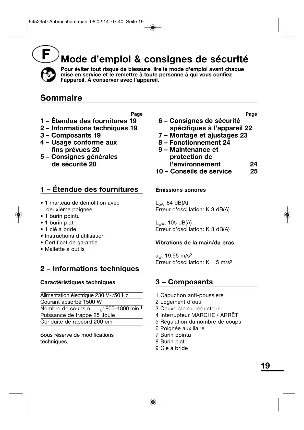 - 1 marteau de démolition avecdeuxième poignée• 1 burin pointu• 1 burin plat• 1 clé à bride• Instructions d’utilisation• Certificat de garantie• Mallette à outils 2 – Informations techniques Caractéristiques techniquesAlimentation électrique 230 V~/50 HzCourant absorbé 1500 WNombre de coups n : 900–1800 min Puissance de frappe 25 JouleConduite de raccord 200 cmSous réserve de modificationstechniques.Émissions sonores