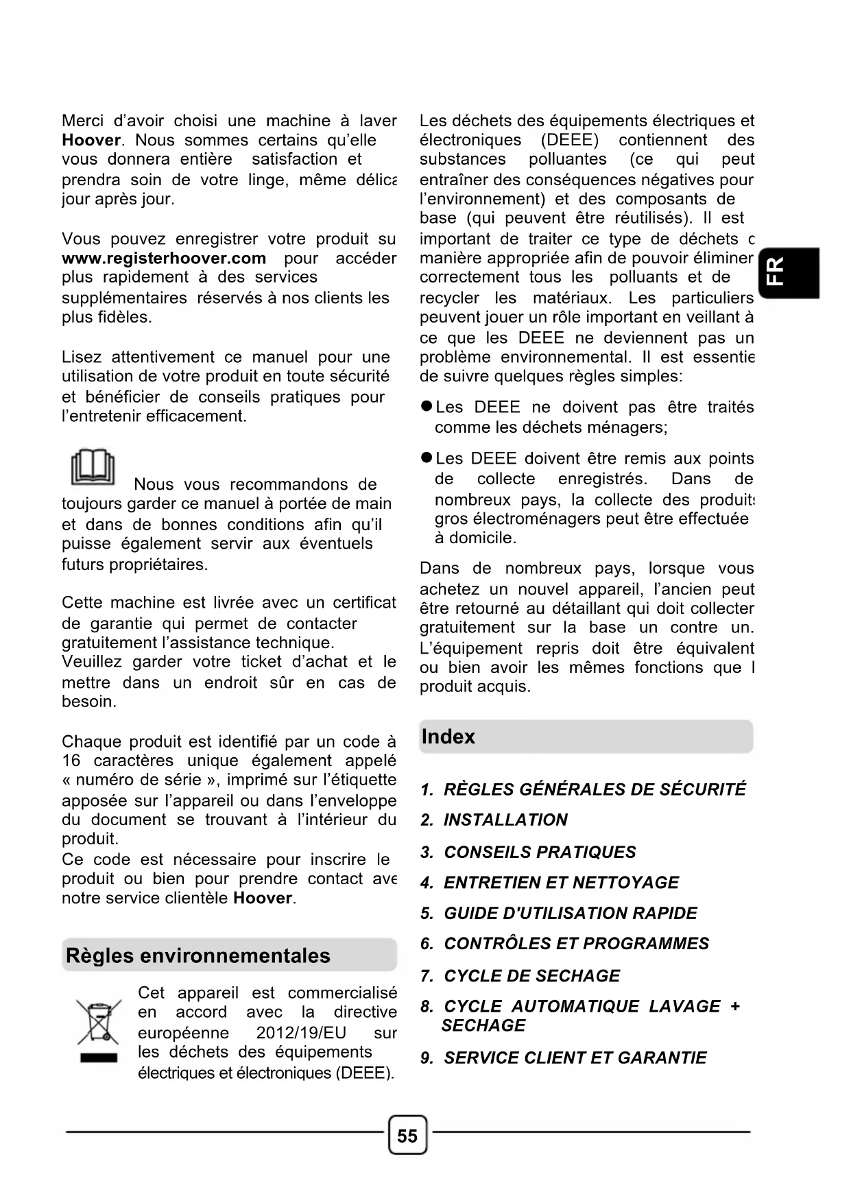 Merci d’avoir choisi une machine à laver Hoover. Nous sommes certains qu’elle vous donnera entière satisfaction et prendra soin de votre linge, même délicat, jour après jour. Vous pouvez enregistrer votre produit sur www.registerhoover.com pour accéder plus rapidement à des services supplémentaires réservés à nos clients les plus fidèles. Lisez attentivement ce manuel pour une utilisation de votre produit en toute sécurité et bénéficier de conseils pratiques pour l’entretenir efficacement. Nous vous recommandons de toujours garder ce manuel à portée de main et dans de bonnes conditions afin qu’il puisse également servir aux éventuels futurs propriétaires. Cette machine est livrée avec un certificat de garantie qui permet de contacter gratuitement l’assistance technique. Veuillez garder votre ticket d’achat et le mettre dans un endroit sûr en cas de besoin. Chaque produit est identifié par un code à 16 caractères unique également appelé « numéro de série », imprimé sur l’étiquette apposée sur l’appareil ou dans l’enveloppe du document se trouvant à l’intérieur du produit. Ce code est nécessaire pour inscrire le produit ou bien pour prendre contact avec notre service clientèle Hoover.