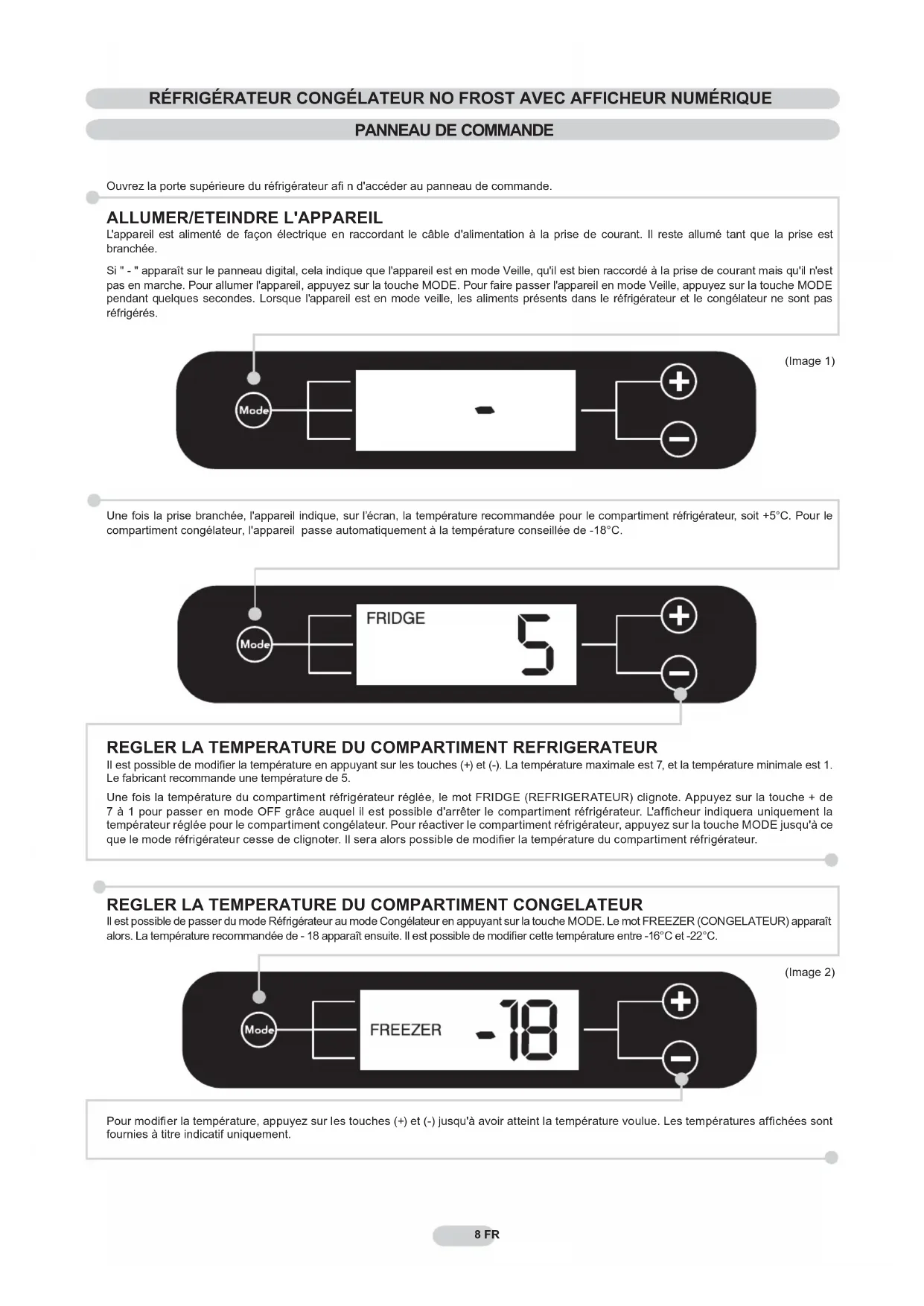 Il est possible de passer du mode Réfrigérateur au mode Congélateur en appuyant sur la touche MODE. Le mot FREEZER (CONGELATEUR) apparaît alors. La température recommandée de - 18 apparaît ensuite. Il est possible de modifi er cette température entre -16°C et -22°C. Pour modifi er la température, appuyez sur les touches (+) et (-) jusqu'à avoir atteint la température voulue. Les températures affi chées sont fournies à titre indicatif uniquement. (Image 1) (Image 2) 8FR8 FR Une fois la prise branchée, l'appareil indique, sur l’écran, la température recommandée pour le compartiment réfrigérateur, soit +5°C. Pour le compartiment congélateur, l'appareil passe automatiquement à la température conseillée de -18°C.9 FR