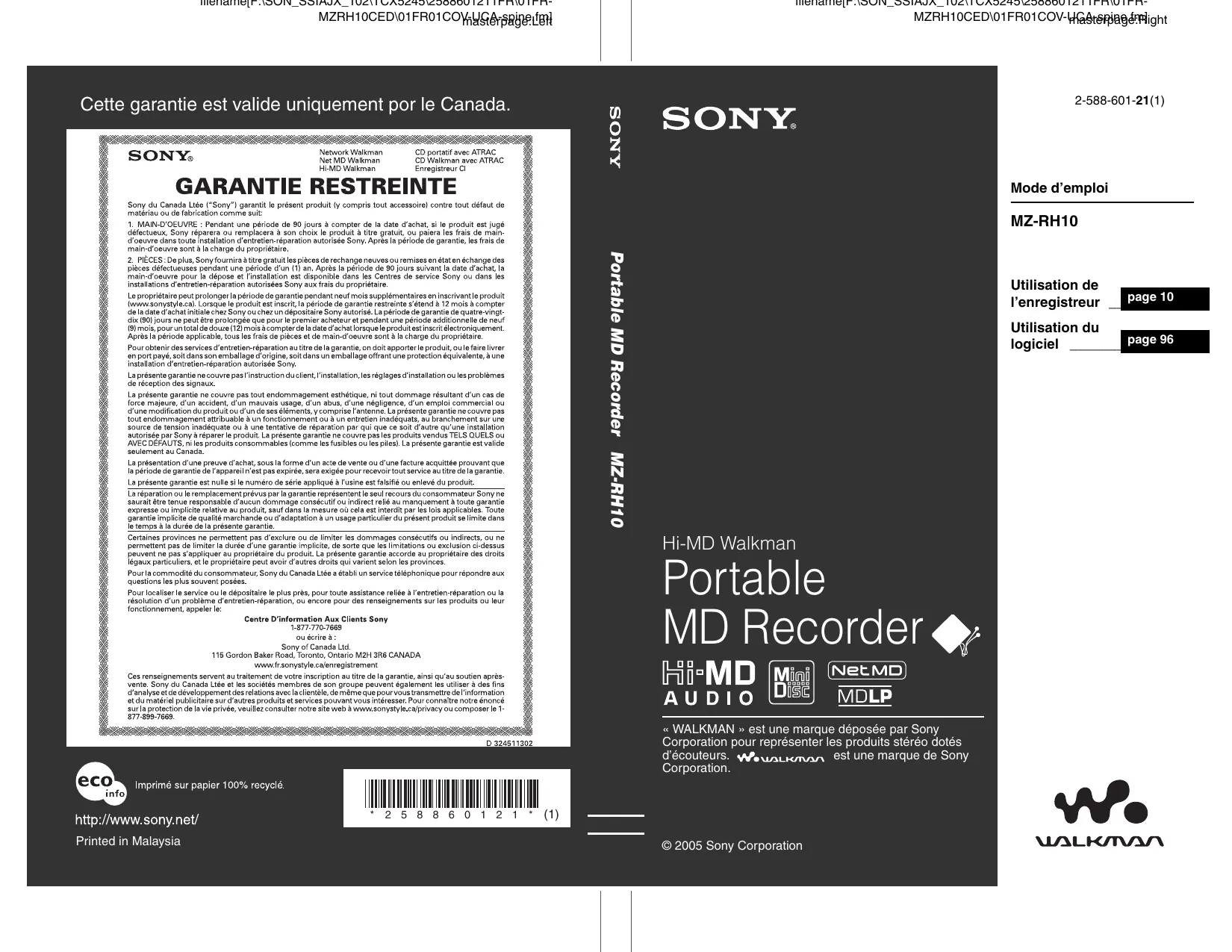 Retrouvez gratuitement la notice de l'appareil MZ-RH10 SONY au format PDF.