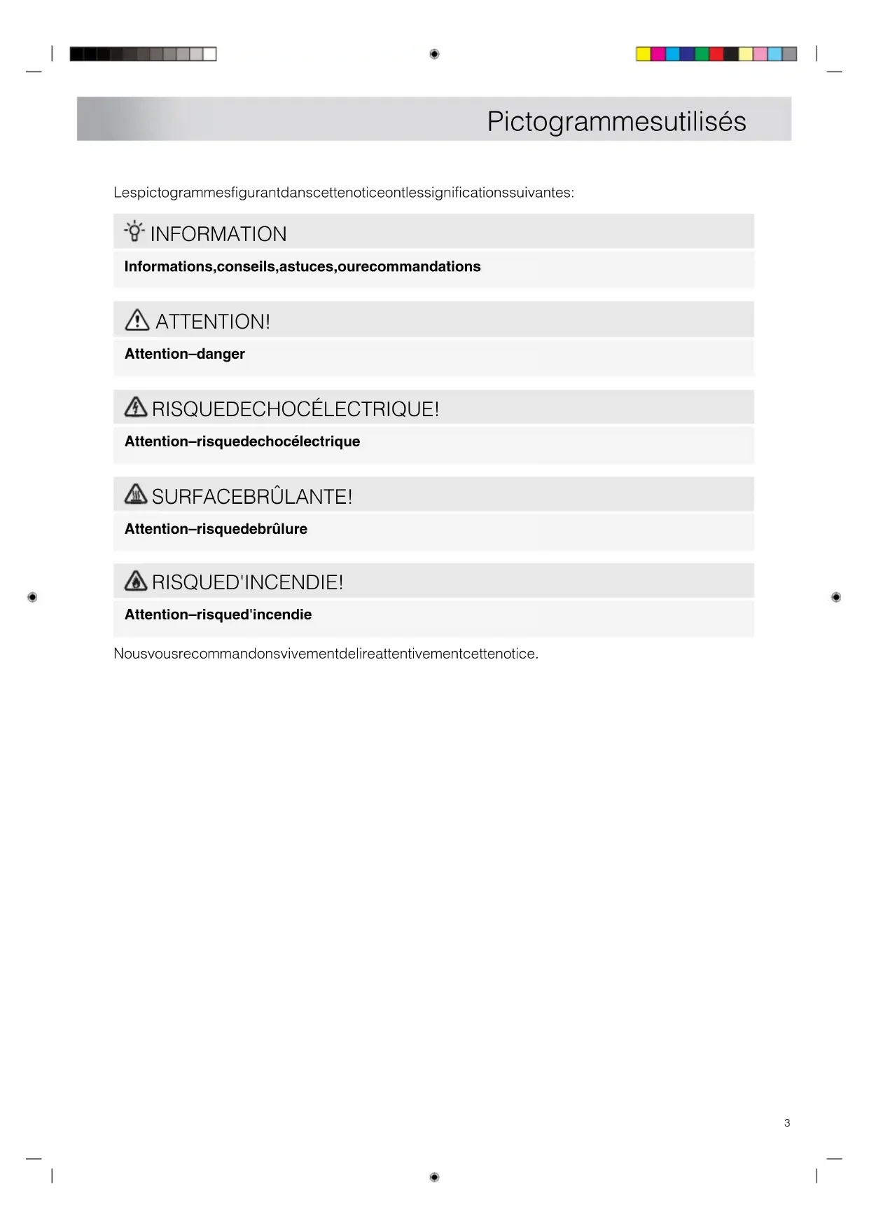 Mise au rebut de l’appareil et de l’embal- lage .............................................................. 16Notes ........................................................... Tables des matièresLes pictogrammes figurant dans cette notice ont les significations suivantes : INFORMATION Informations, conseils, astuces, ou recommandations ATTENTION ! Attention – danger RISQUE DE CHOC ÉLECTRIQUE ! Attention – risque de choc électrique SURFACE BRÛLANTE ! Attention – risque de brûlure RISQUE D'INCENDIE ! Attention – risque d'incendie Nous vous recommandons vivement de lire attentivement cette notice.