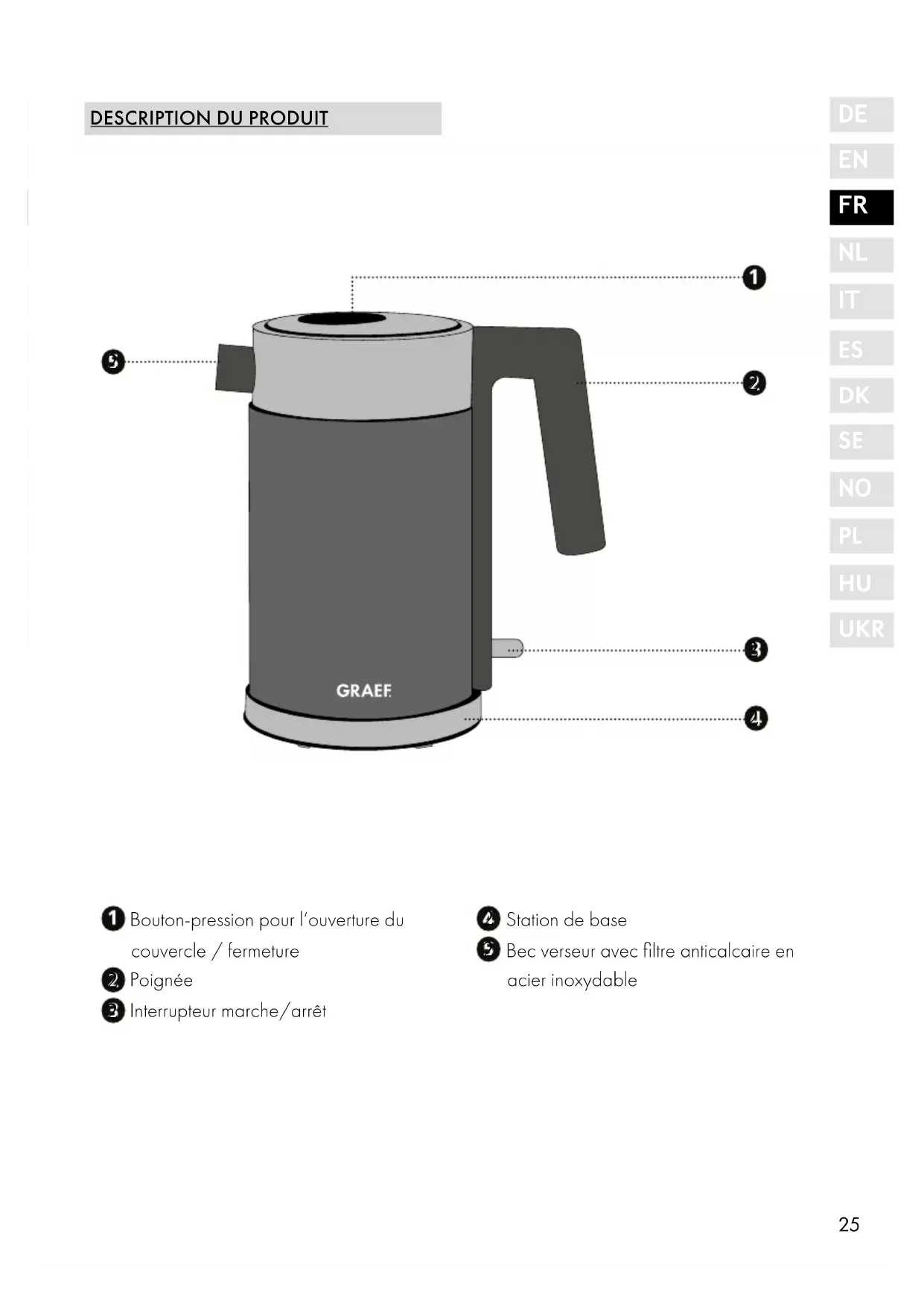 AVANT-PROPOS Chère cliente, cher client, Vous avez fait le bon choix en achetant cette bouilloire électrique. Vous avez acquis un produit de qualité éprouvé. Nous vous remercions pour votre achat et nous vous souhaitons beaucoup de plaisir avec votre bouilloire électrique Graef.
