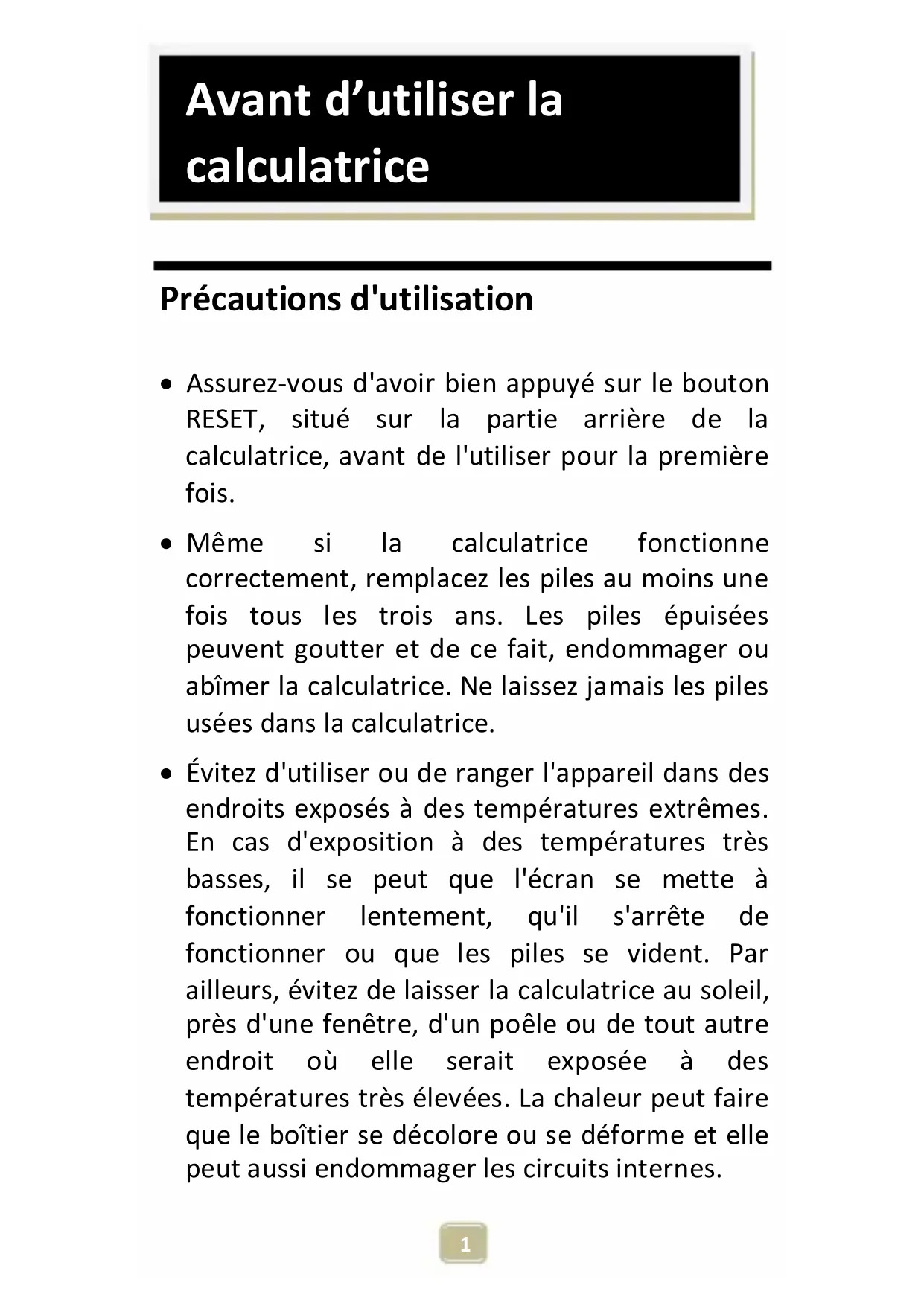 - Retirer les piles de la calculatrice si vous n'avez pas l'intention d'utiliser celle-ci pendant une longue période de temps. Comment remplacer la batterie ?