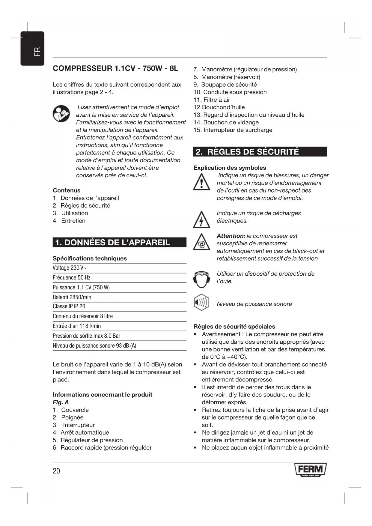 Spécifications techniques Voltage 230 V~ Fréquence 50 Hz Puissance 1.1 CV (750 W) Ralenti 2850/min Classe IP IP 20 Contenu du réservoir 8 litre Entrée d’air 118 l/min Pression de sortie max 8.0 Bar Niveau de puissance sonore 93 dB (A) Lebruitdel’appareilvariede1à10dB(A)selon l’environnement dans lequel le compresseur est placé. Informations concernant le produit Fig. A