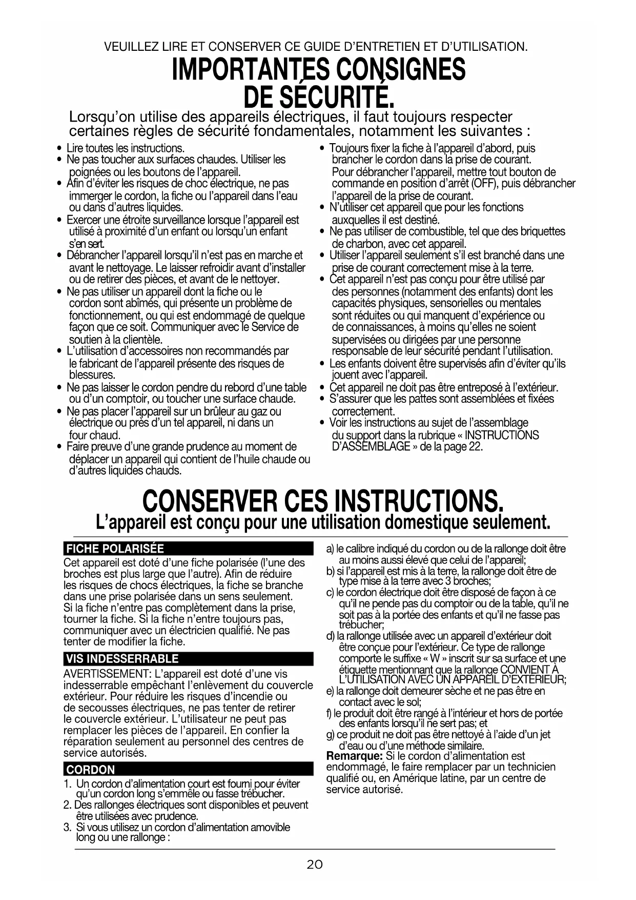 - Voir les instructions au sujet de l’assemblage du support dans la rubrique « INSTRUCTIONS D’ASSEMBLAGE » de la page 22. VEUILLEZ LIRE ET CONSERVER CE GUIDE D’ENTRETIEN ET D’UTILISATION. IMPORTANTES CONSIGNES DE SÉCURITÉ. Lorsqu’on utilise des appareils électriques, il faut toujours respecter certaines règles de sécurité fondamentales, notamment les suivantes : CONSERVER CES INSTRUCTIONS. L’appareil est conçu pour une utilisation domestique seulement.