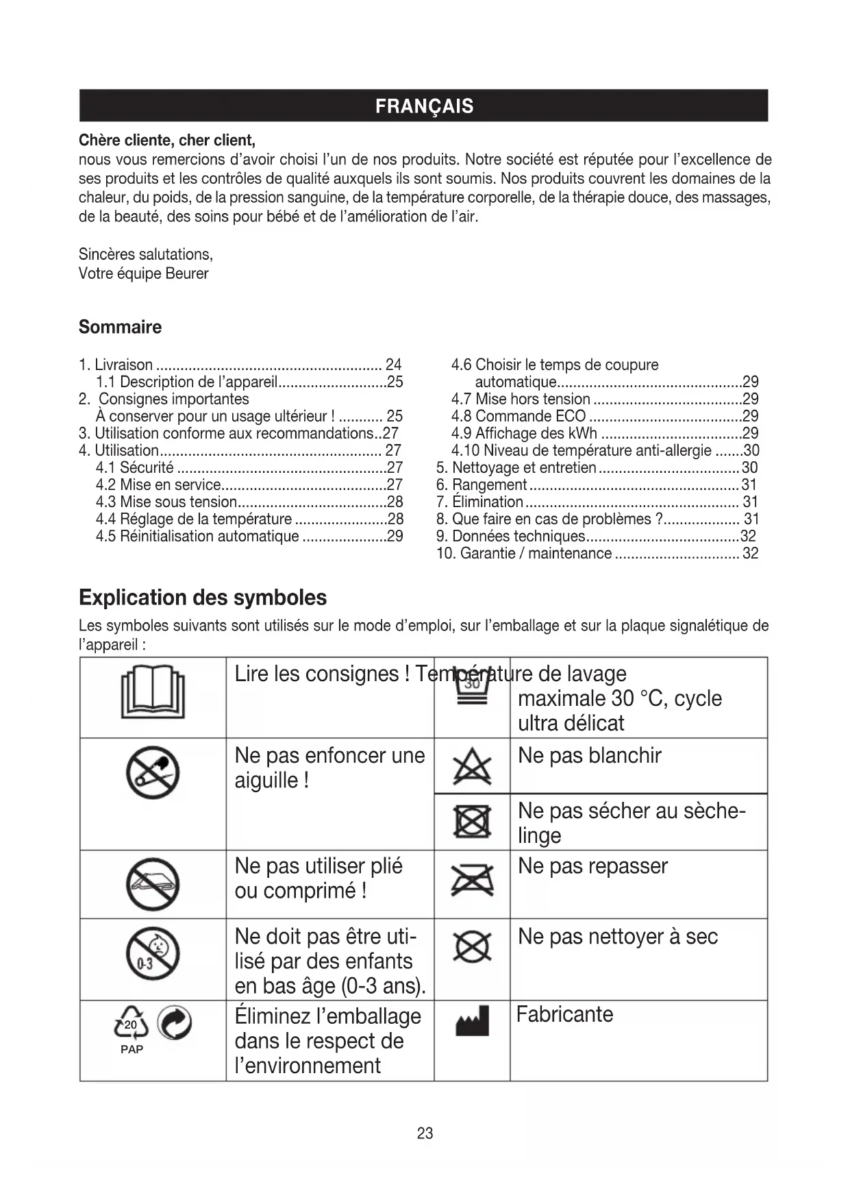 damage that arises during transport between manufacturer and customer, or between service centre and customer; – products purchased as seconds or as used goods; – consequential damage arising from a fault in this product (however, in this case, claims may exist arising from product liability or other compulsory statutory liability provisions). Repairs or an exchange in full do not extend the warranty period under any circumstances.23 Explication des symboles Les symboles suivants sont utilisés sur le mode d’emploi, sur l’emballage et sur la plaque signalétique de l’appareil: Lire les consignes ! Température de lavage maximale 30°C, cycle ultra délicat Ne pas enfoncer une aiguille ! Ne pas blanchir Ne pas sécher au sèche- linge Ne pas utiliser plié ou comprimé ! Ne pas repasser Ne doit pas être uti- lisé par des enfants en bas âge (0-3 ans). Ne pas nettoyer à sec