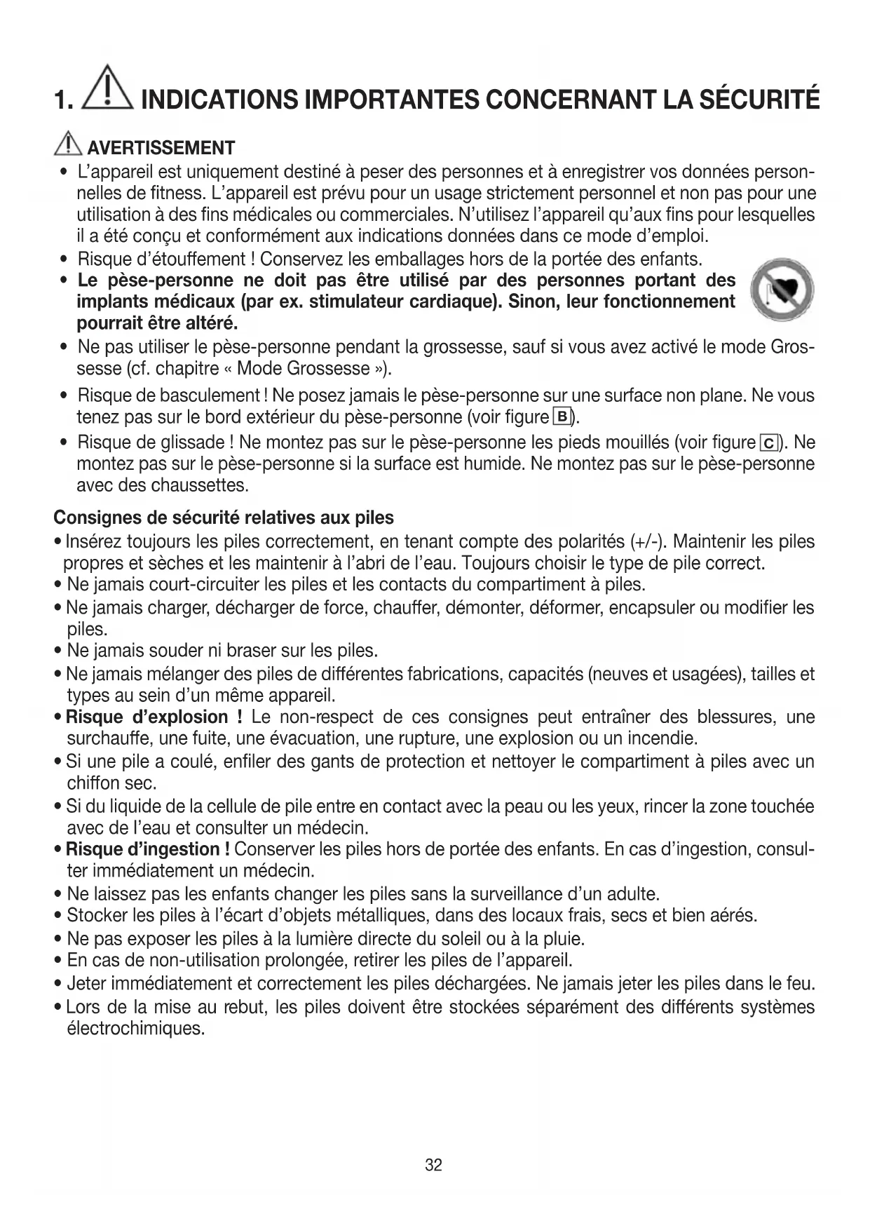 ). Ne montez pas sur le pèse-personne si la surface est humide. Ne montez pas sur le pèse-personne avec des chaussettes. Consignes de sécurité relatives aux piles